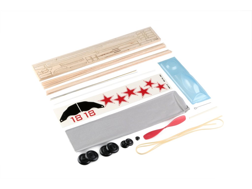 Stavebnice obsahuje: balsové laserem vyřezávané díly, balsové nosníky, vakuově lisované díly (kryt kabiny...), plastovou vrtuli s hřídelí a hlavicí, gumový svazek (soutěžní guma FAI TAN II), kola, ocelovou strunu na podvozek a další drobné díly, barevný potahový papír, aršík samolepek, stavební plán.