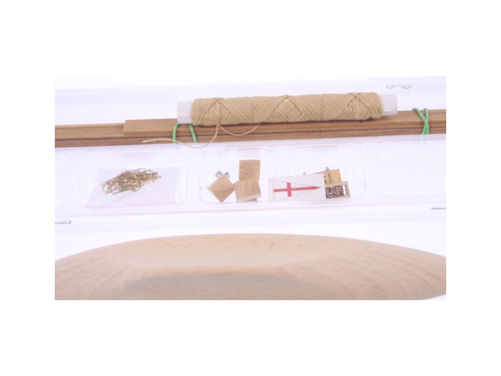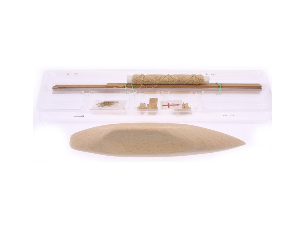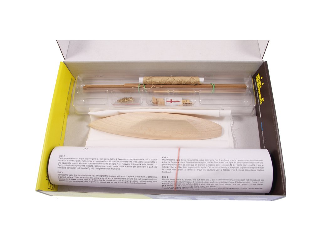 Balení obsahuje hotový polotovar trupu, překližkové díly, dřevěné lišty, blistr s drobnými díly, sadu výkresů a návod.