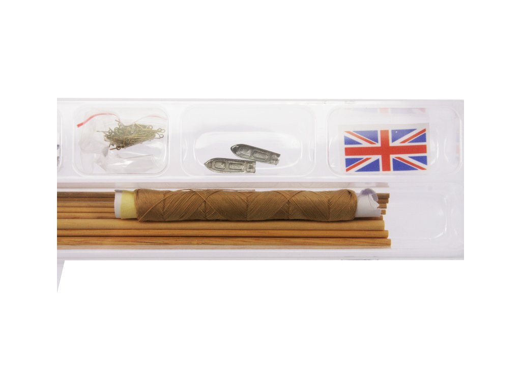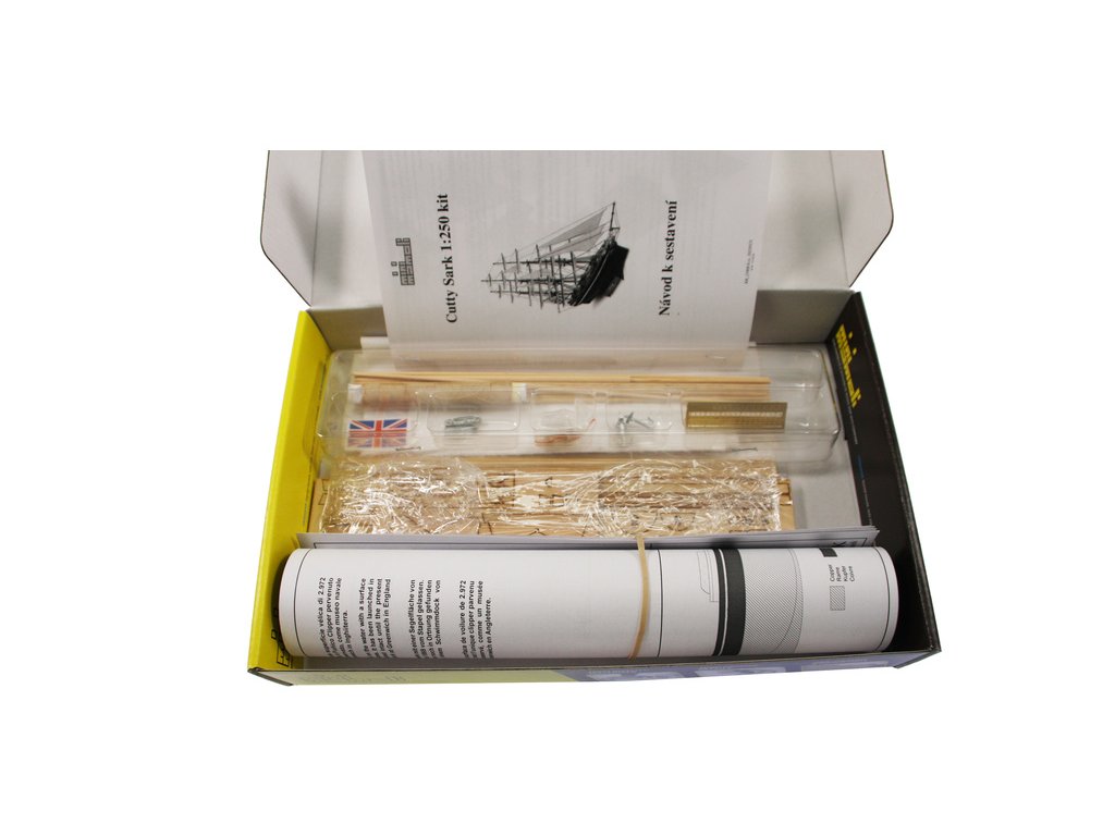 Balení obsahuje sadu překližkových dílů, sadu dřevěných lišt o různém průřezu, sáčky s drobnými díly, díly z mosazi, sadu výkresů, vícejazyčný manuál a český návod k sestavení.