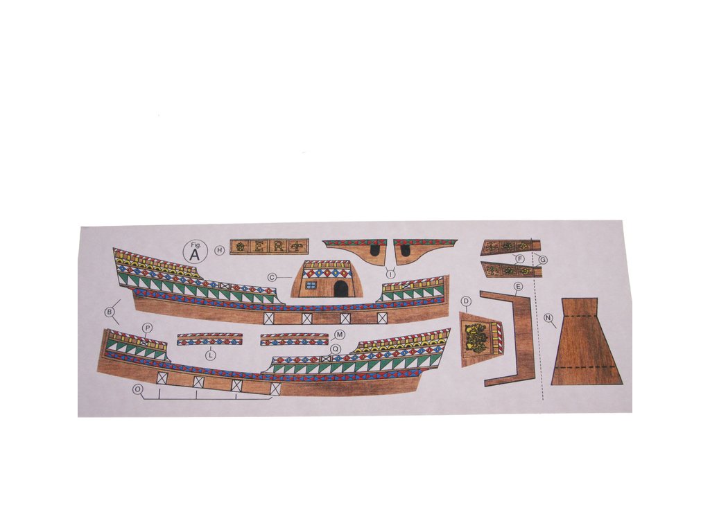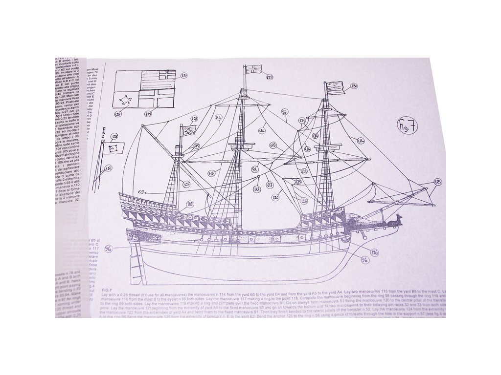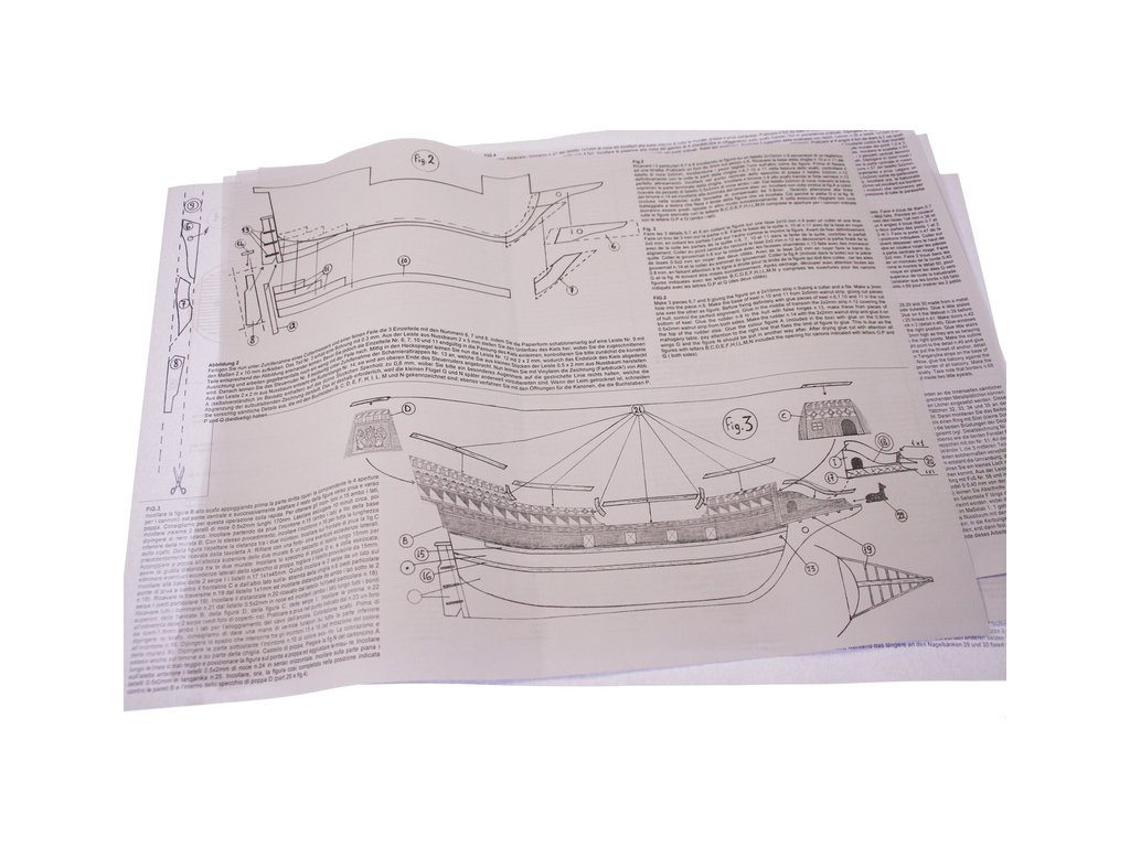 Balení obsahuje sadu překližkových dílů, sadu dřevěných lišt o různém průřezu, blistr s drobnými díly, sadu výkresů a manuál anglický, německý, francouzský a italský.