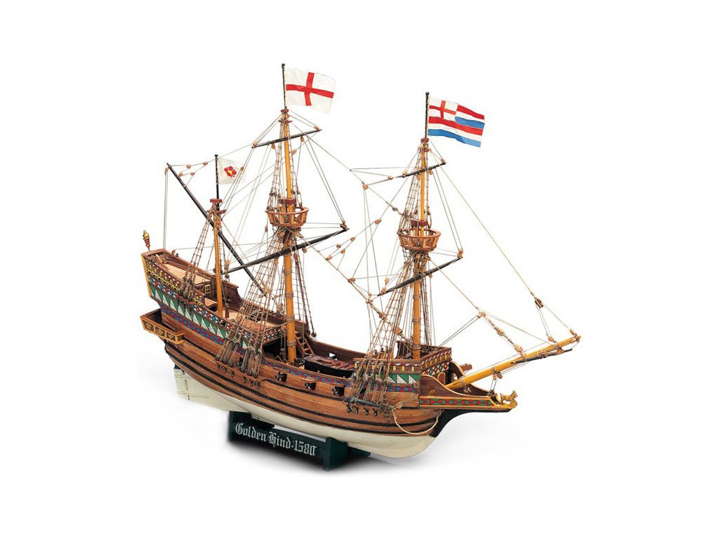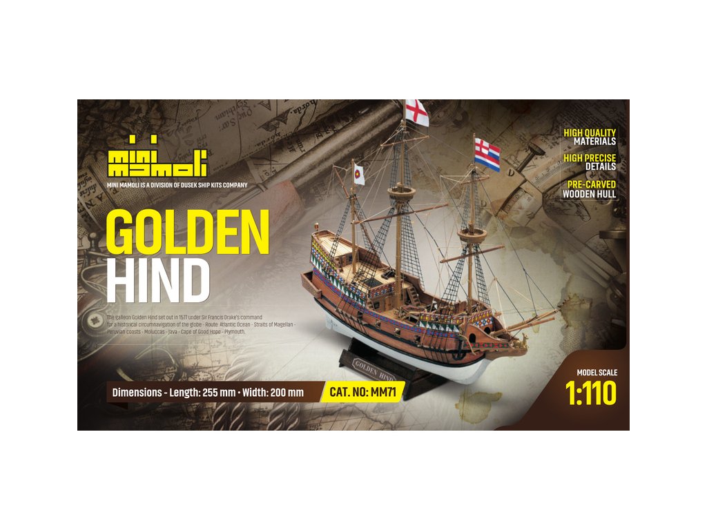 Model lodi Golden Hind, z řady Mini Mamoli, v měřítku 1:110. Golden Hind (Zlatá laň) byla vlajkovou lodí Francise Drakea, na níž obeplul v letech 1577–1580 zeměkouli. Stavebnice obsahuje vyřezané dřevění díly, kovové díly, stojánek a návod.