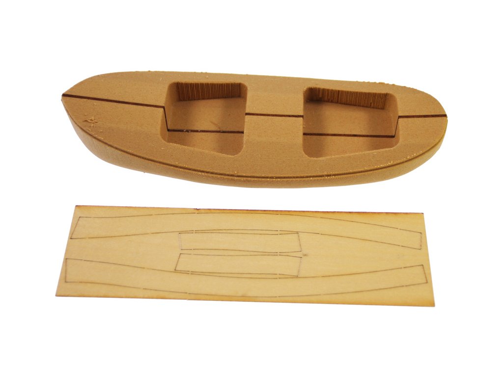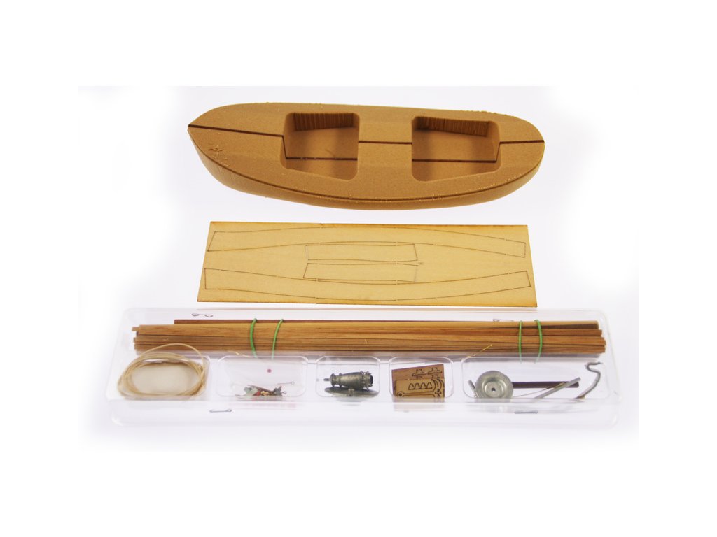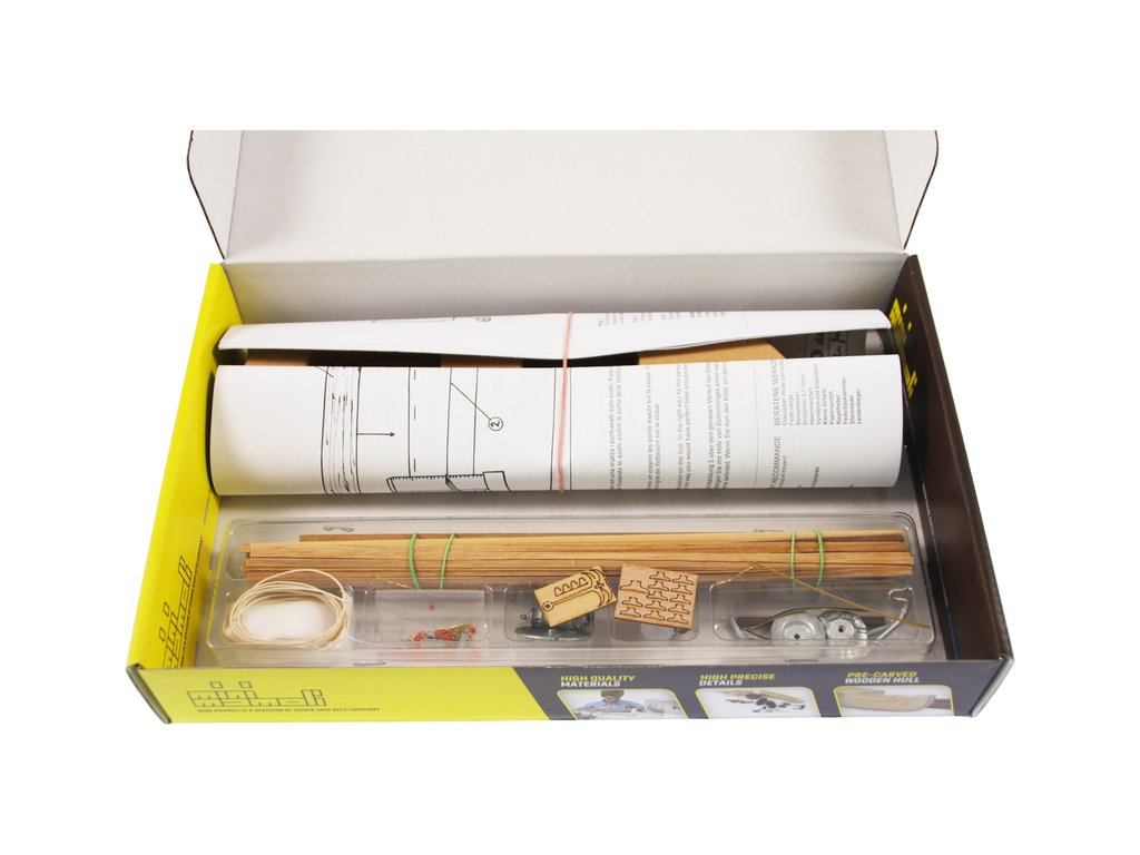 Balení obsahuje hotový polotovar trupu, překližkové díly, dřevěné lišty, blistr s drobnými díly, sadu výkresů a návod.