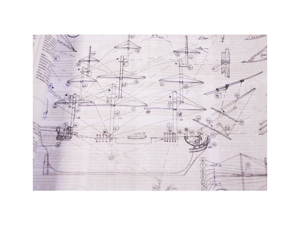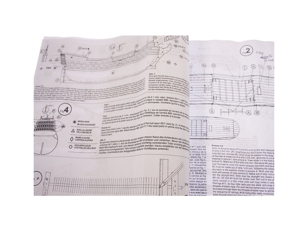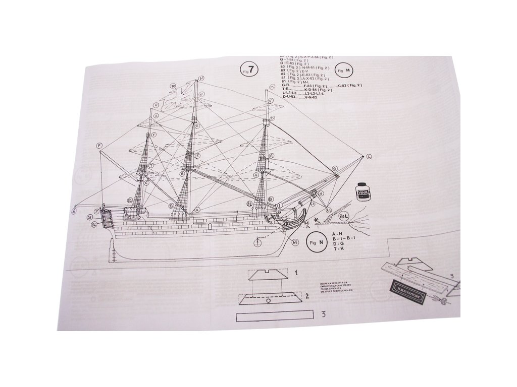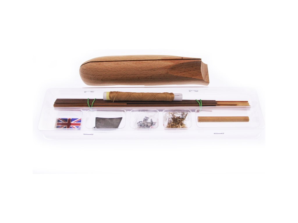 Balení obsahuje sadu překližkových dílů, sadu dřevěných lišt o různém průřezu, blistr s drobnými díly, sadu výkresů a manuál anglický, německý, francouzský a italský.