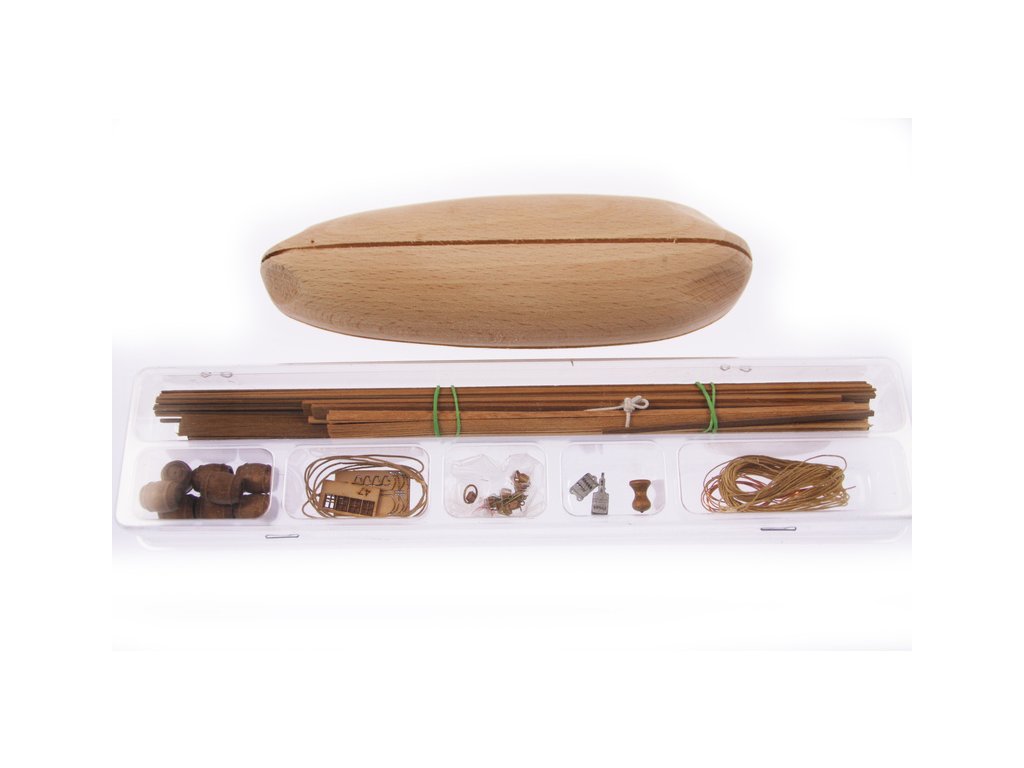 Balení obsahuje hotový polotovar trupu, překližkové díly, dřevěné lišty, blistr s drobnými díly, sadu výkresů a návod.
