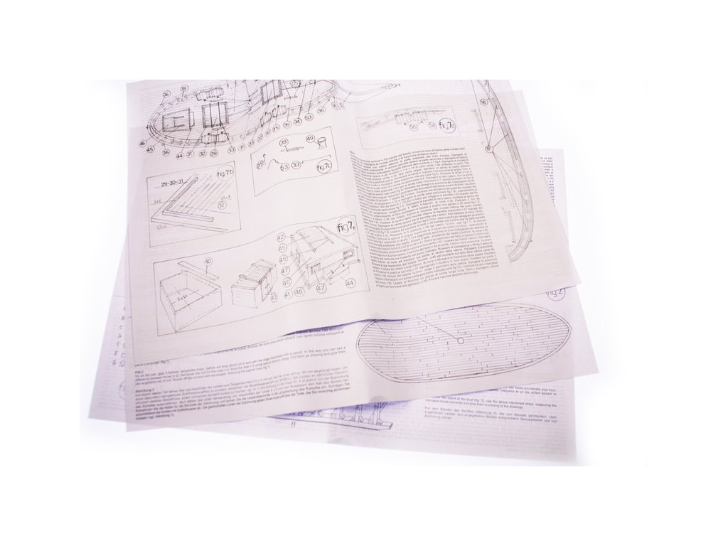 Po otevření víka krabice naleznete dřevěné díly modelu, drobné součásti uzavřené v plastovém průhledném blistru a sadu výkresů.