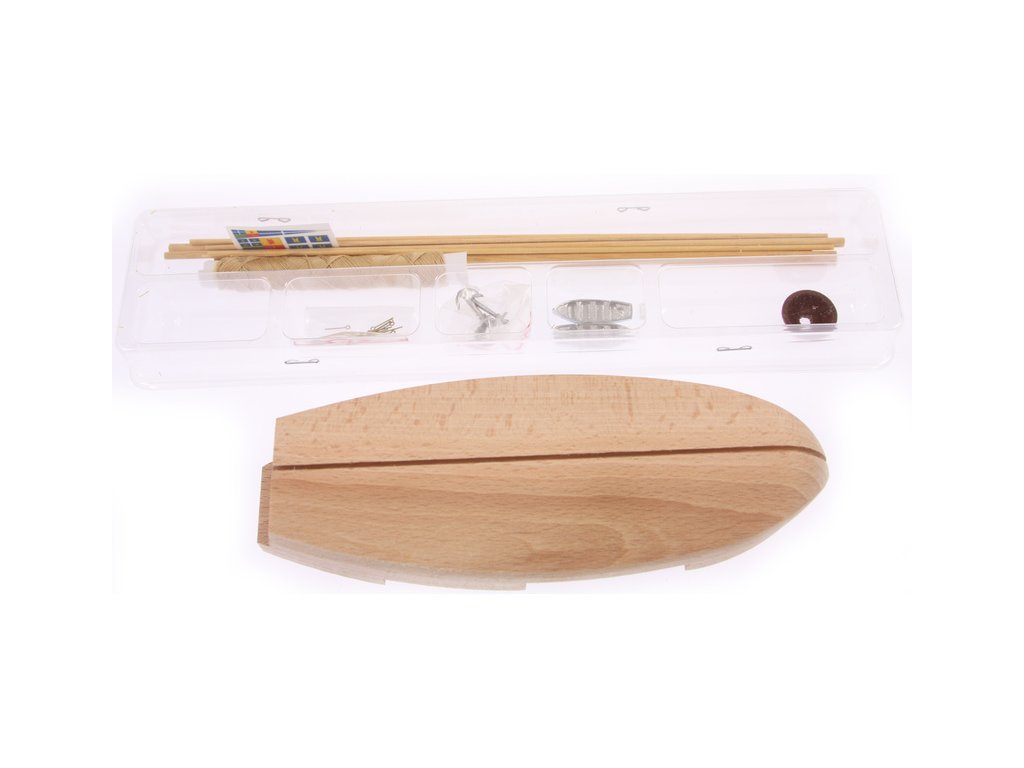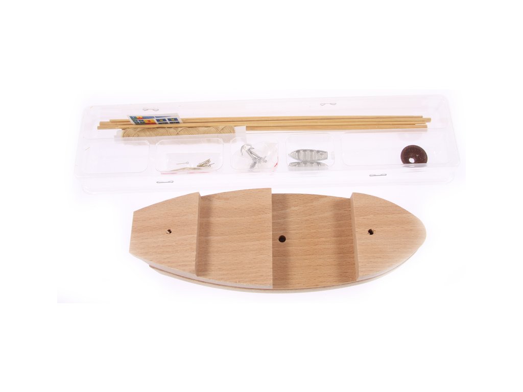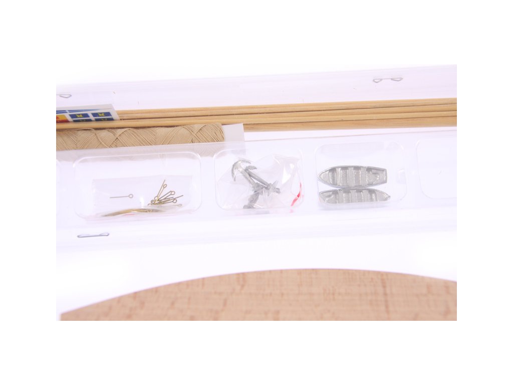 Balení obsahuje hotový polotovar trupu, překližkové díly, dřevěné lišty, blistr s drobnými díly, sadu výkresů a návod CZ.