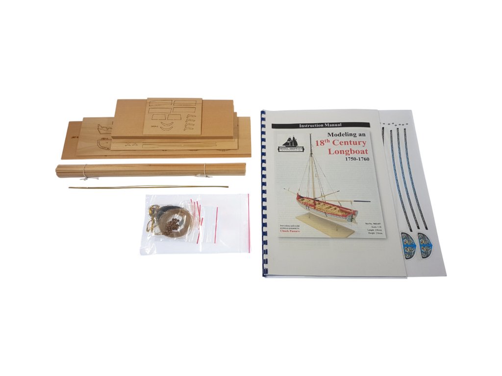 Součástí balení stavebnice statického modelu lodi Model Shipways Longboat 1:48, je sada výkresů modelu, manuál, sada překližkových laserem řezaných dílů, lišty, mosazné plíšky, dráty, hřebíky, kladky, nitě na lanoví, vytištěné ozdobné prvky, odlitek kotvy, apod.