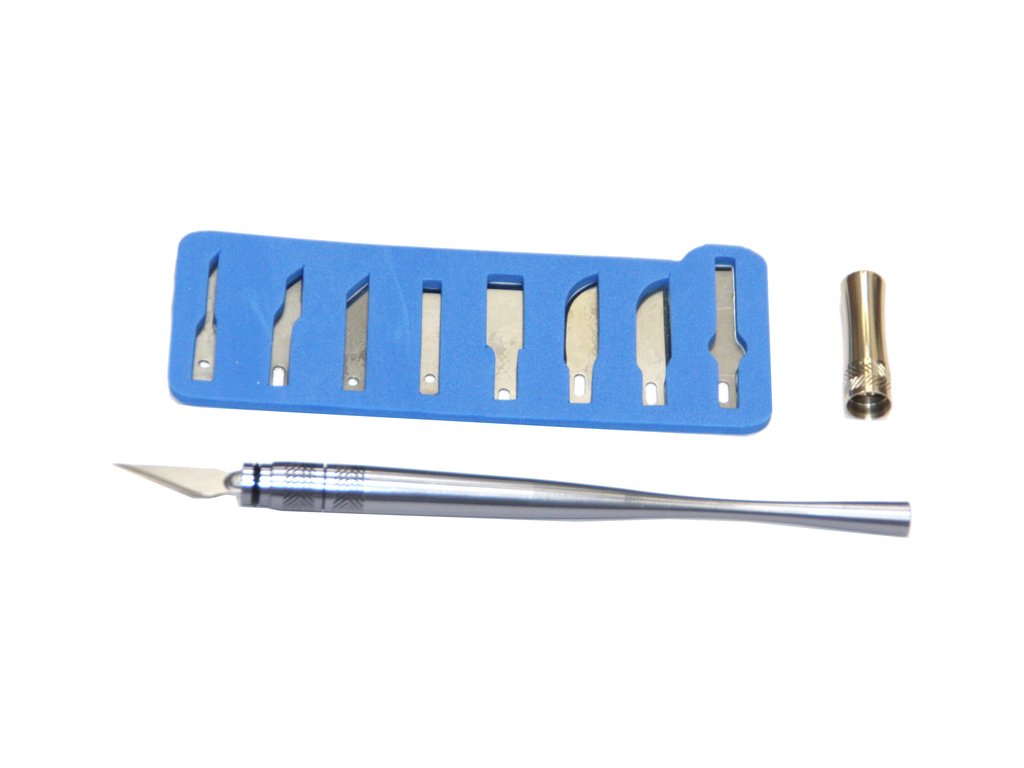 Profesionální modelářský nůž s devíti různě tvarovanými čepelemi, dlouhou rukojetí a bezpečnostní hliníkovou krytkou.