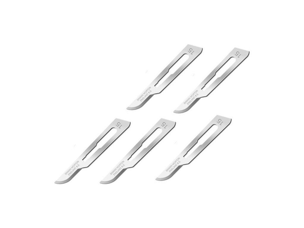 Modelcraft čepel skalpelu Swann Morton typ #15 (5ks) se zaobleným ostřím. Určeno do držáku čepelí varianta #3. Vyrobeno z vysoce kvalitní uhlíkové oceli.