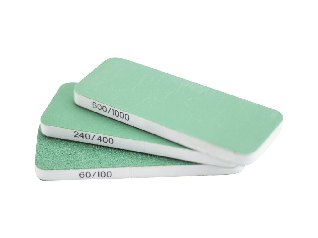 V balení jsou 3 ks flexibilních oboustranných brousítek 80 x 30 x 6 mm, na každé straně jinou hrubostí - hrubé P60/P100, střední P240/P400 a jemné P600/P1000. Tvarem se přizpůsobí i zaobleným plochám.