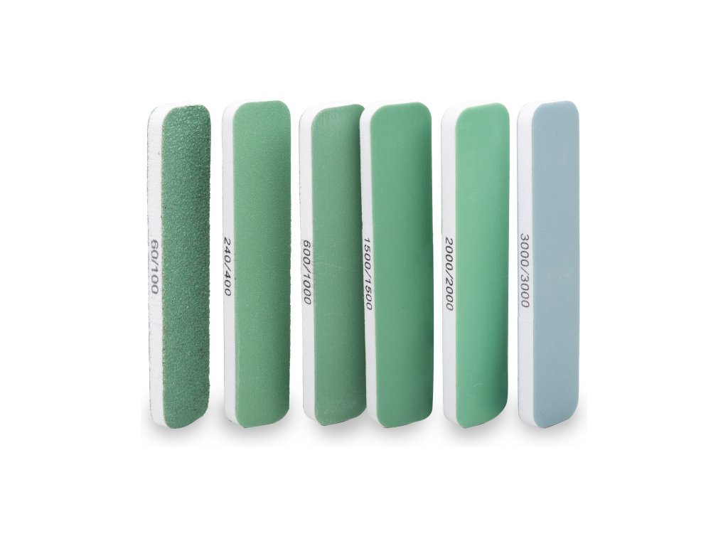 V balení je 6 ks flexibilních oboustranných brousítek o rozměru 90x19x8 mm s těmito hrubostmi: P60/P100, P240/P400, P600/P1000, P1500, P2000 a P3000. Tvarem se přizpůsobí i zaobleným plochám.