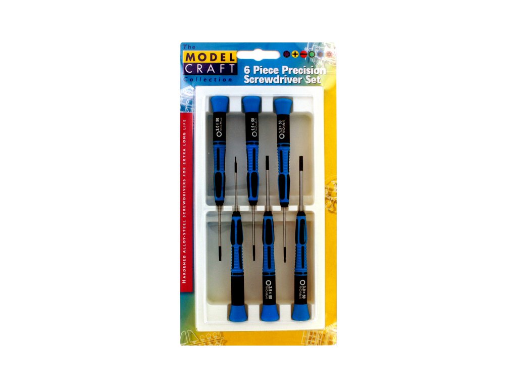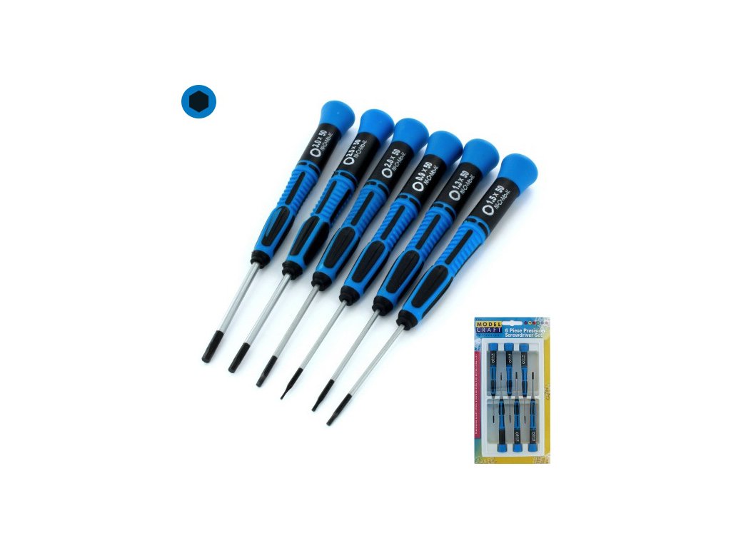 Modelcraft imbus šroubováky (sada 6ks) z nerezové oceli s pracovní částí s černou povrchovou úpravou z chromové oceli. Dříky mají stejný průměr jak rozměr šroubováku, délka dříku je 50mm. Rozměry: 0.9mm, 1.3mm, 1.5mm, 2.0mm, 2.5mm, 3.0mm. Plastové ručky s otočnou hlavicí o délce 100 mm a průměru 12 mm.