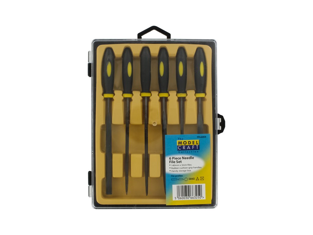 Modelcraft jehlové pilníky s gumovou rukojetí (sada 6ks) mají délku 140mm. Nezbytný nástroj při práci s kovy, dřevem či plasty. Průřezy pilníků jsou obdélník, čtverec, kruh, půlkulatý a trojúhelníkový. Ocelové kalené pracovní části. Dodává se v praktickém úložném boxu.