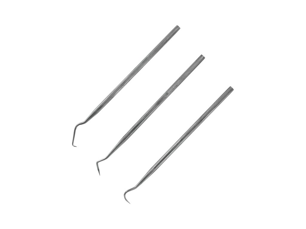 Sada 3 kusů mini háčků Modelcraft z nerezové oceli. Tyto ocelové nástroje umožňují přesné tvarování a rytí na modelech a různých předmětech. Usnadní práci modelářům a řemeslníkům při jemném vyhlazování a nanášení měkkých materiálů a tmelů.