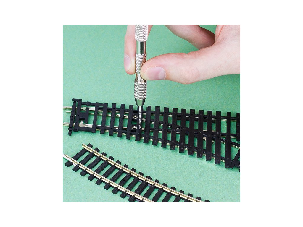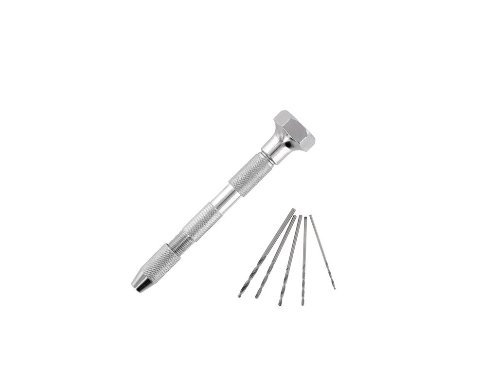 Modelcraft mini ruční vrtačka s 5 vrtáky pro přesné práce s malými vrtáky. V balení jsou vrtáky 1mm; 1,2mm; 1,4mm; 1,5mm a 1,8mm a 2 kleštiny s upínacím rozpětím 0-1,2 mm, & 1,3-2,4 mm a 0,8-2,0 mm, & 1,8-2,9 mm. Otočná rukojeť pro pohodlou práci. Délka 100mm, kleština 10mm.