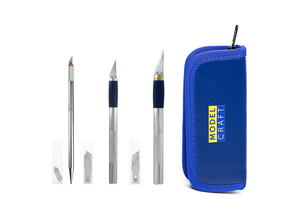 Modelcraft modelářské nože v pouzdru (sada 18 ks) - modelářská řezací sada v praktické pouzdře obsahuje: malý nůž s rydlem a čepelí, profesionální nůž malý a profesionální nůž velký. Přiložené výměnné čepele různých typů pro široké spektrum řezů.