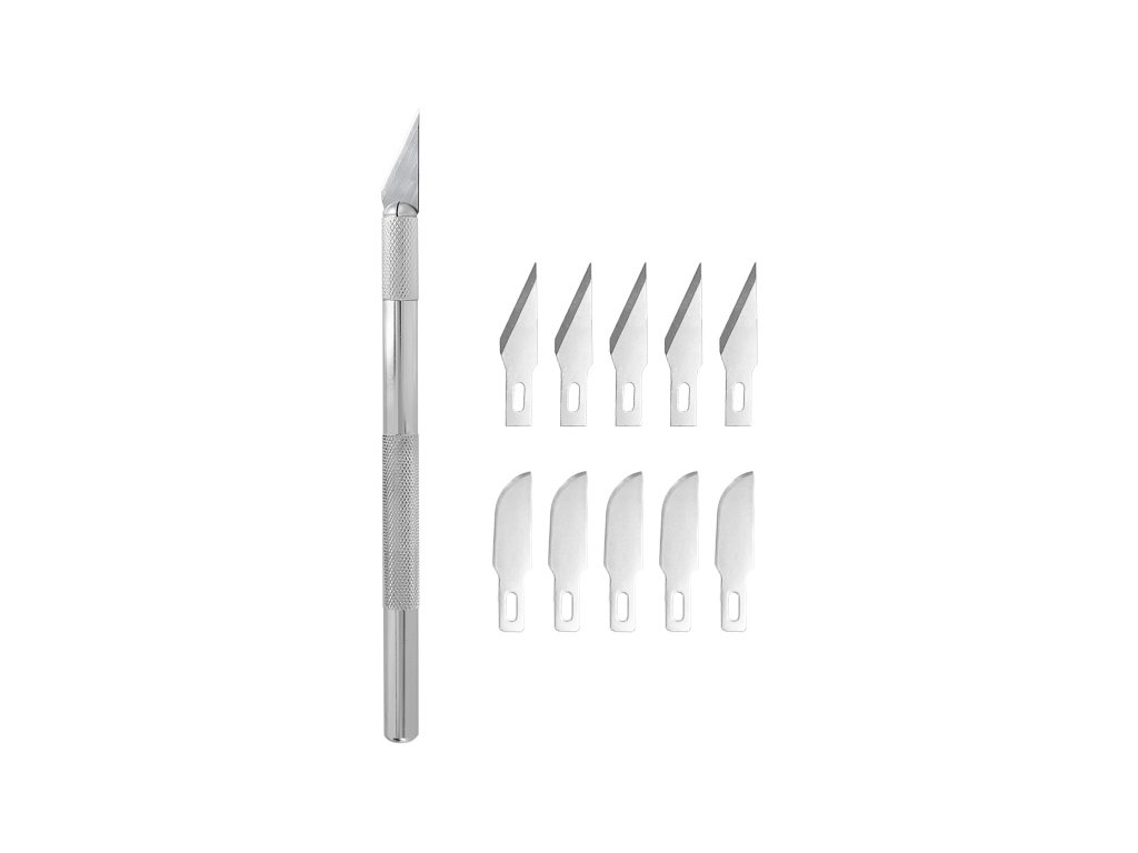Klasický celokovový modelářský nůž s 10 výměnnými čepelemi (5 rovných, 5 oblých) pro řemeslníky, modeláře a profesionály.