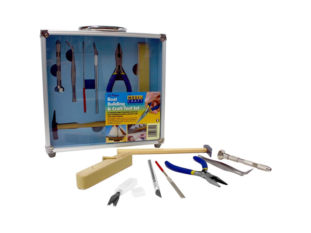 Modelcraft nářadí pro lodní modeláře (sada 12ks). Dodává se v atraktivním hliníkovém kufru 240mm x 235mm x 60mm. Hmotnost 691g. Obsahuje mini kleště, řezací nůž, 5x11 čepelí, brusný blok, diamantový plochý pilník, kladívko, zahnutou pinzetu a Modelcraft mini ruční vrtačku.