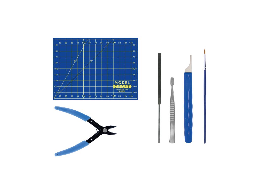 Modelcraft startovací sada nářadí pro modeláře – základní výbava pro stavbu plastikových modelů. Obsahuje základní nástroje, které jsou potřebné pro práci s plastikovými stavebnicemi. Sada neobsahuje ostré čepele, což ji činí bezpečnou pro začátečníky.