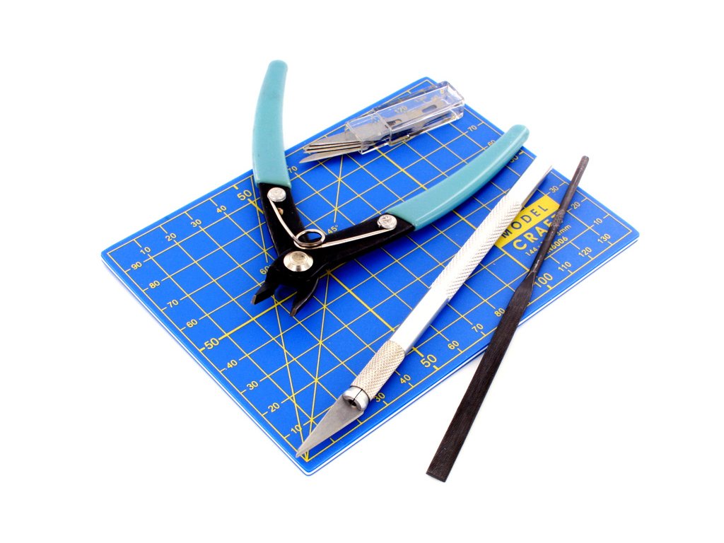 Modelcraft nářadí pro plastikové modely (sada 9ks) lze využít nejen při stavbě plastikových modelů. Obsahuje řezací podložku A6, modelářský nůž s hliníkovou rukojetí a náhradními čepelemi, plochý pilník a štípací kleště.
