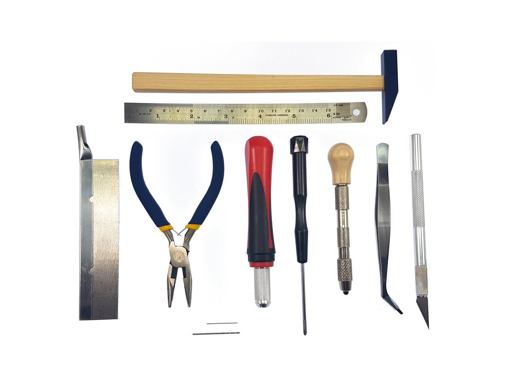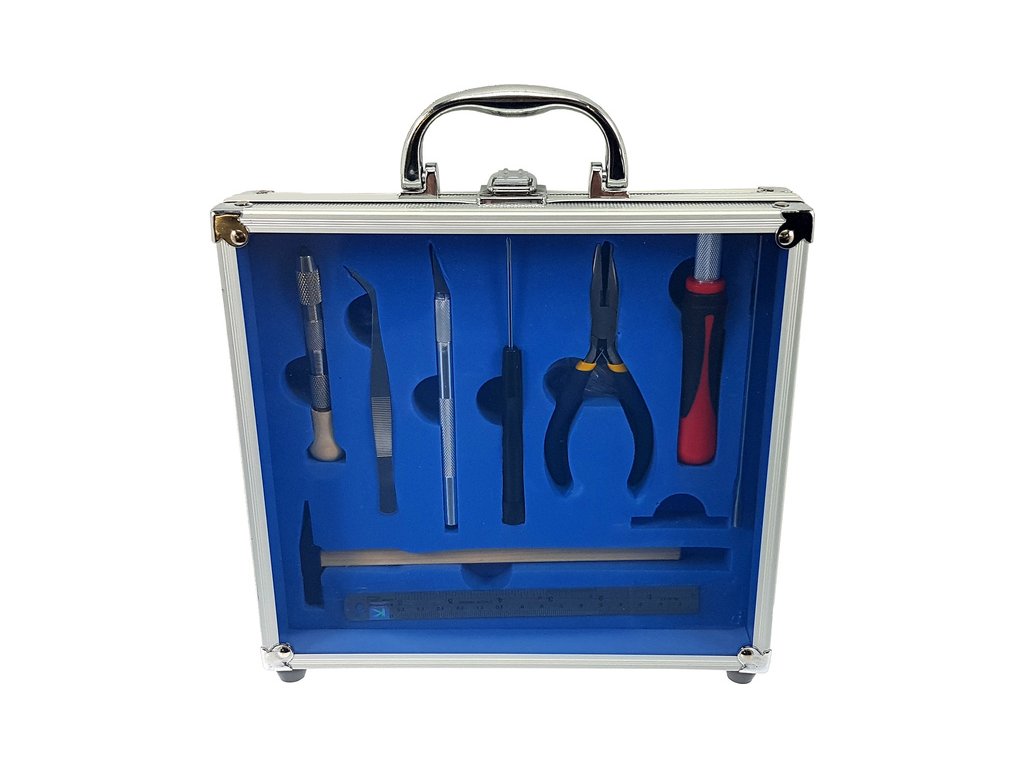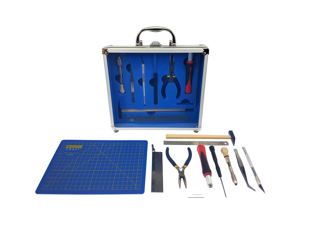 Modelcraft kvalitní nářadí pro železniční modeláře, vhodné pro jemné a přesné práce. Sada dvanácti kusů, včetně řezací podložky formátu A5, v praktickém hliníkovém kufříku. Obsahuje: mini kladívko, pravítko, pilku, kleště, šroubovák, mini ruční vrtačka s vrtáky, pinzetu, řezací nůž.