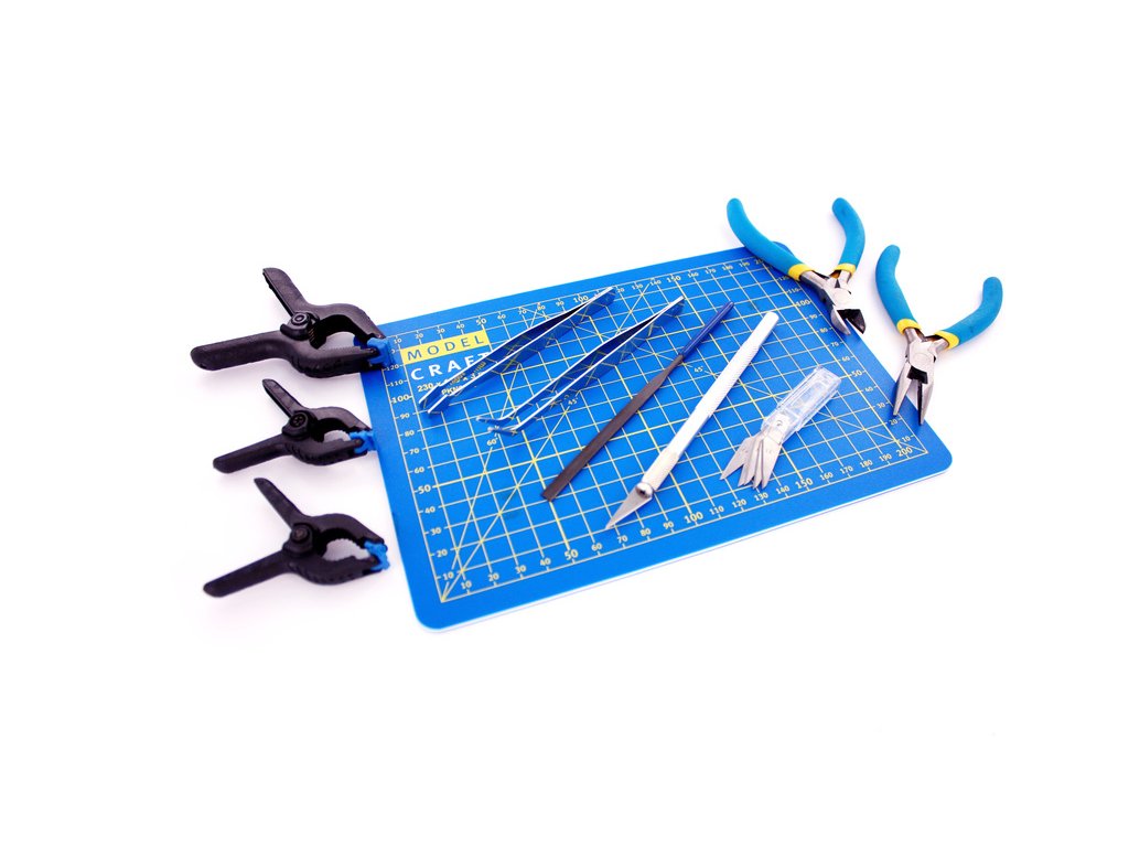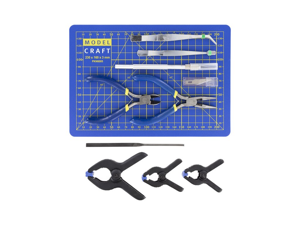 Modelcraft nářadí s řezací podložkou (sada 15ks) je 15-ti dílná sada nářadí pro pro řemeslníky, modeláře a kutily. Obsahuje řezací podložku A5, nůž č.5 s náradními listy, 5ks svěrky 50mm, 1ks svěrky 75mm, plochý pilník, kleště štípací a ploché úzké, pinzeta zahnutá a plochá.