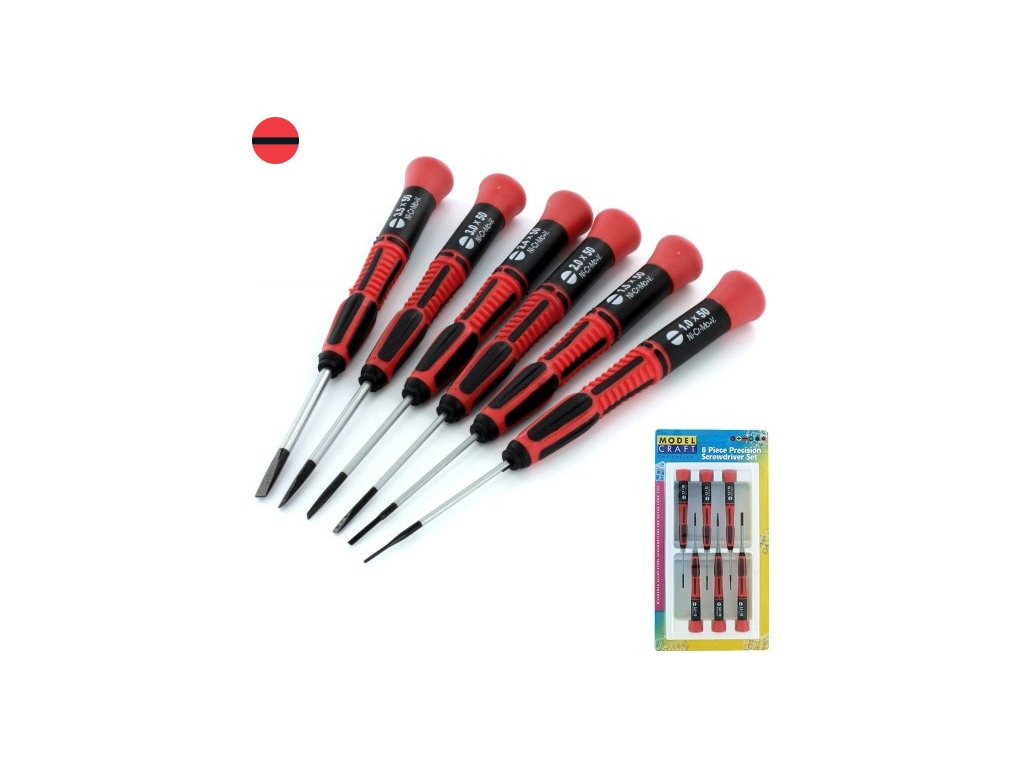 Modelcraft ploché šroubováky ( sada 6 ks ) z nerezové oceli s černou povrchovou úpravou a pracovní částí z nikl chrom molybdenové oceli. Dříky mají stejný průměr jak rozměr šroubováku, délka dříku je 50 mm. Rozměry: 1.0, 1.5, 2.0, 2.4, 3.0, 3.5 mm.