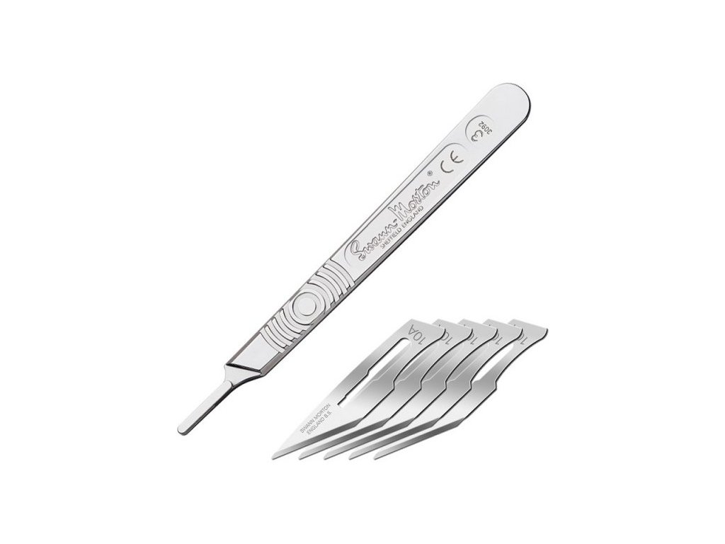 Profesionální skalpel Swann Morton s rukojetí z nerezové oceli, držákem čepelí varianta #3 a s pěti čepelemi z uhlíkové oceli typu #10A. Jedná se o precizní nástroj pro modelářské, řemeslné a výtvarné činnosti na řezání, vyřezávání, škrábání a rýsování materiálů jako je papír, karton, kůže, fólie, plasty, akrylát, balza a další. Do rukojeti lze nasadit čepele různých tvarů ostří pro specifické potřeby, viz. příslušenství.