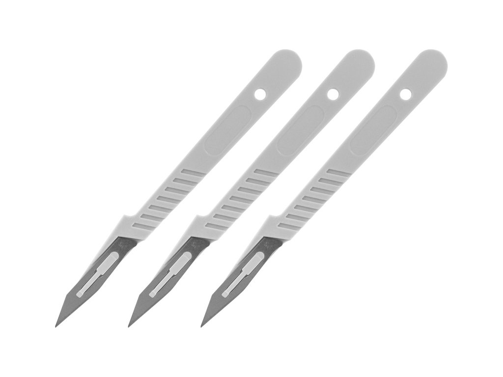 Modelcraft skalpel s rukojetí 3ks v balení pro jemné řezy, které jsou potřeba při speciální modelářské a kutilské práci. Dodává se s nylonovou rukojetí, vestavěným chráničem prstů a bezpečnostní čepičkou. Jednorázové použití. Délka 150mm, šířka 15mm.