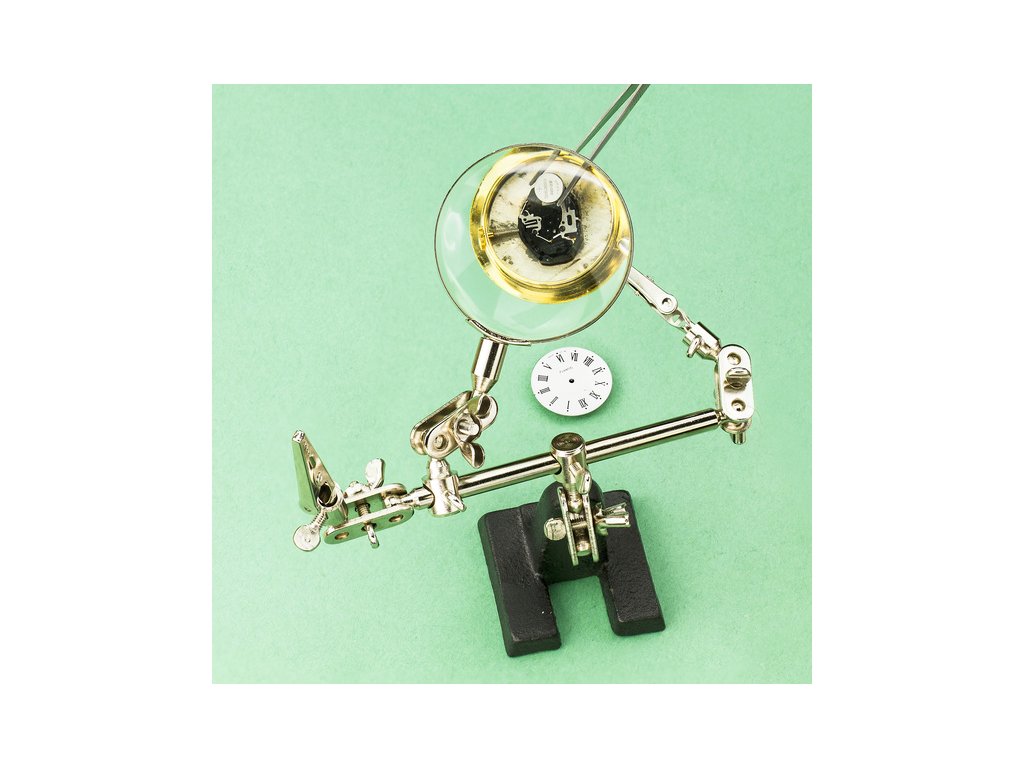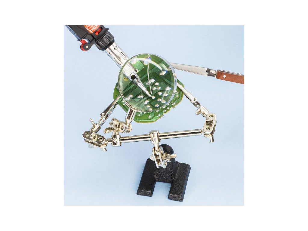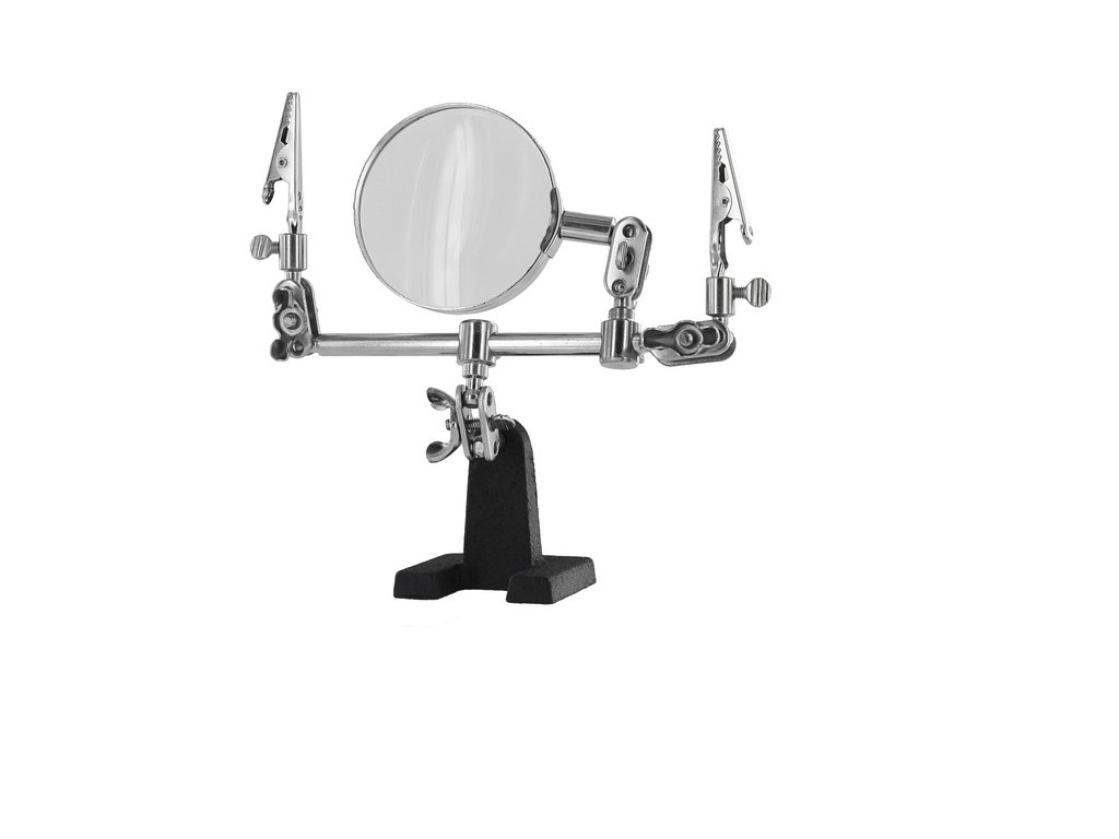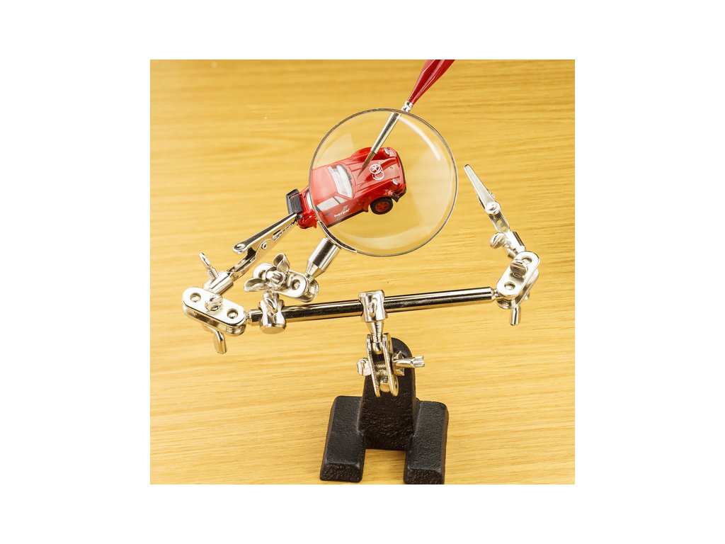 Modelcraft stojánek s lupou a svorkami je užitečné univerzální zařízení, pro uchycení předmětů během montáže, pájení, barvení, apod. Stojánek má krokosvorky pro uchycení a nastavitelné klouby pro polohování v různých směrech. lupa má 2x zvětšení.