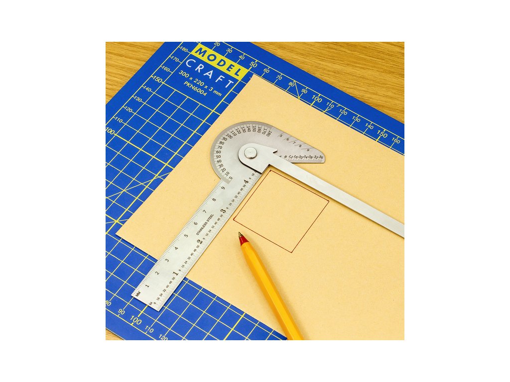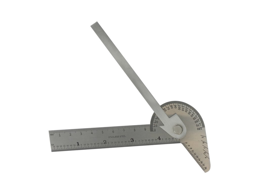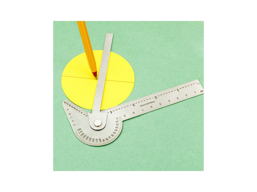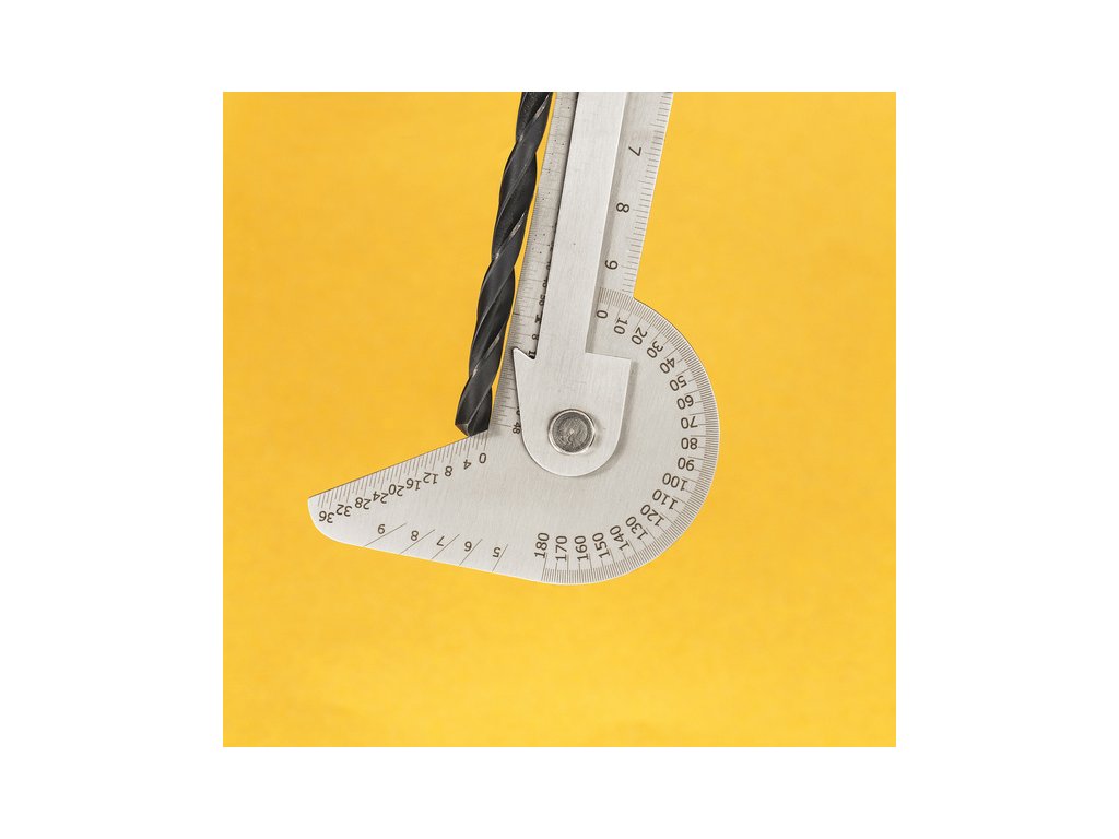 Modelcraft univerzální ocelový úhloměr 5-v-1 s měřítkem 100mm, měří přesně úhel, lze orýsovat střed kružnice, rozdělí kružnici do sektorů, polygonů a polygramů (až 9 stejných částí), změří správný vrcholový úhel břitu po nabroušení vrtáku. Lze použít pro rýsování i měření.