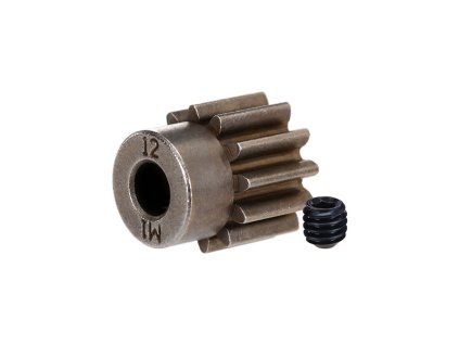 Traxxas pastorek na hřídel 5 mm s 12 zuby a modulem ozubení 1 mm pro RC modely aut. Vyrobeno z sintrované oceli. Součástí balení je červík.