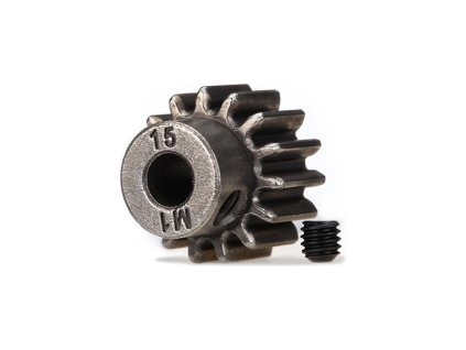Traxxas pastorek na hřídel 5 mm s 15 zuby a modulem ozubení 1 mm pro RC modely aut. Vyrobeno z kalené nástrojové oceli. Součástí balení je červík.