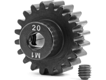 Traxxas pastorek na hřídel 5 mm s 20 zuby a modulem ozubení 1 mm pro RC modely aut. Vyrobeno z kalené oceli. Součástí balení je stavěcí šroub.