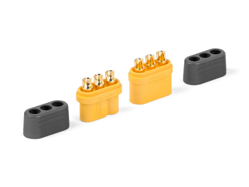 Dvoukolíkový silový konektor se 3,5 mm zlacenými kontakty se zatížitelností max. 60 A. Pro kabely o průřezu max. 3,3 mm2 (12AWG). Přechodový odpor 0,55 mOhm, max. 500 V. Ideální pro propojování střídavých elektromotorů a regulátorů. Balení 5 párů.Doplňkové parametry