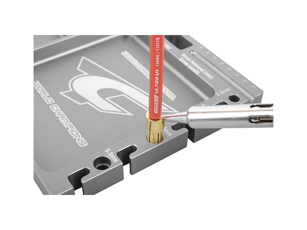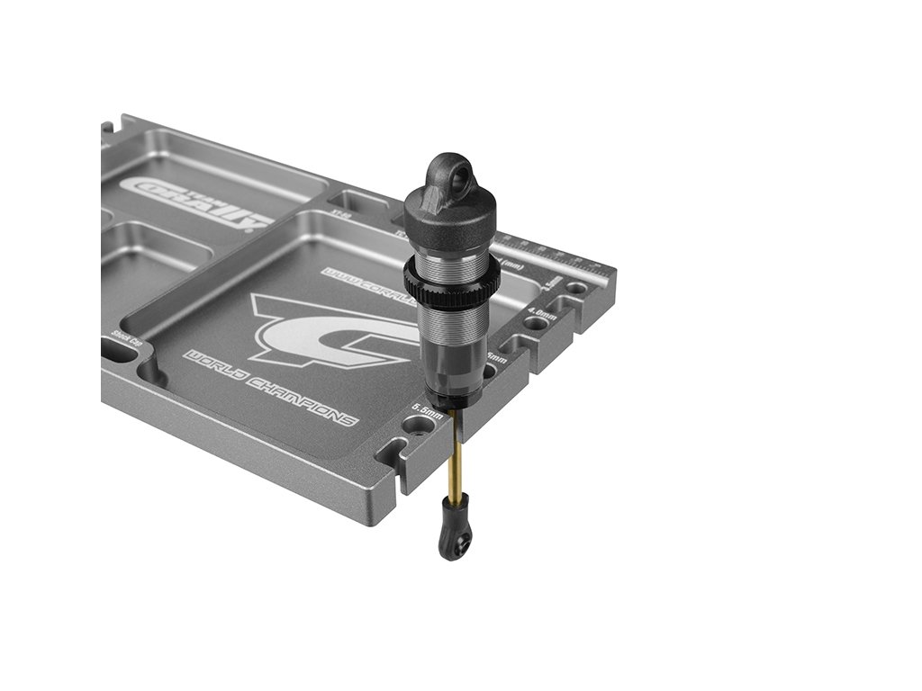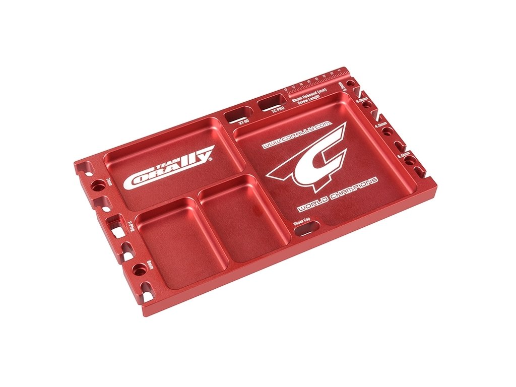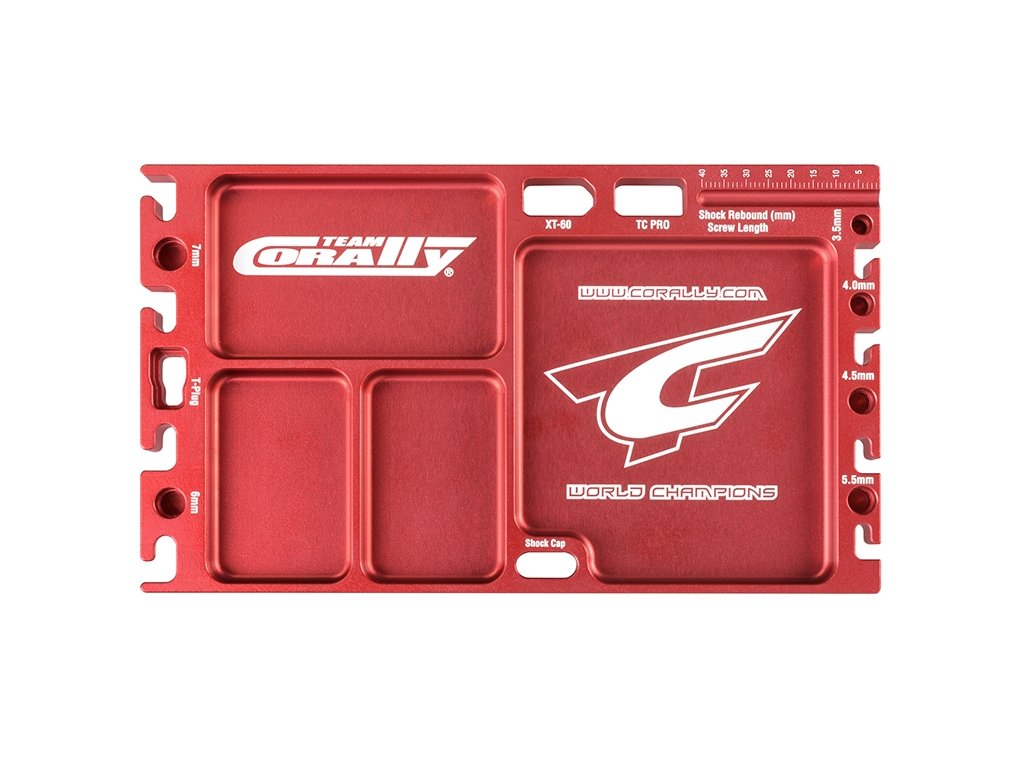 Masivní hliníková multifunkční deska je skvělý pomocník při servisu Vašich RC modelů aut. Obsahuje 4 přihrádky na drobné díly, držáky konektorů, držáky tlumičů a pístnic tlumičů a měřidlo. Povrch je červeně eloxovaný.Doplňkové parametry