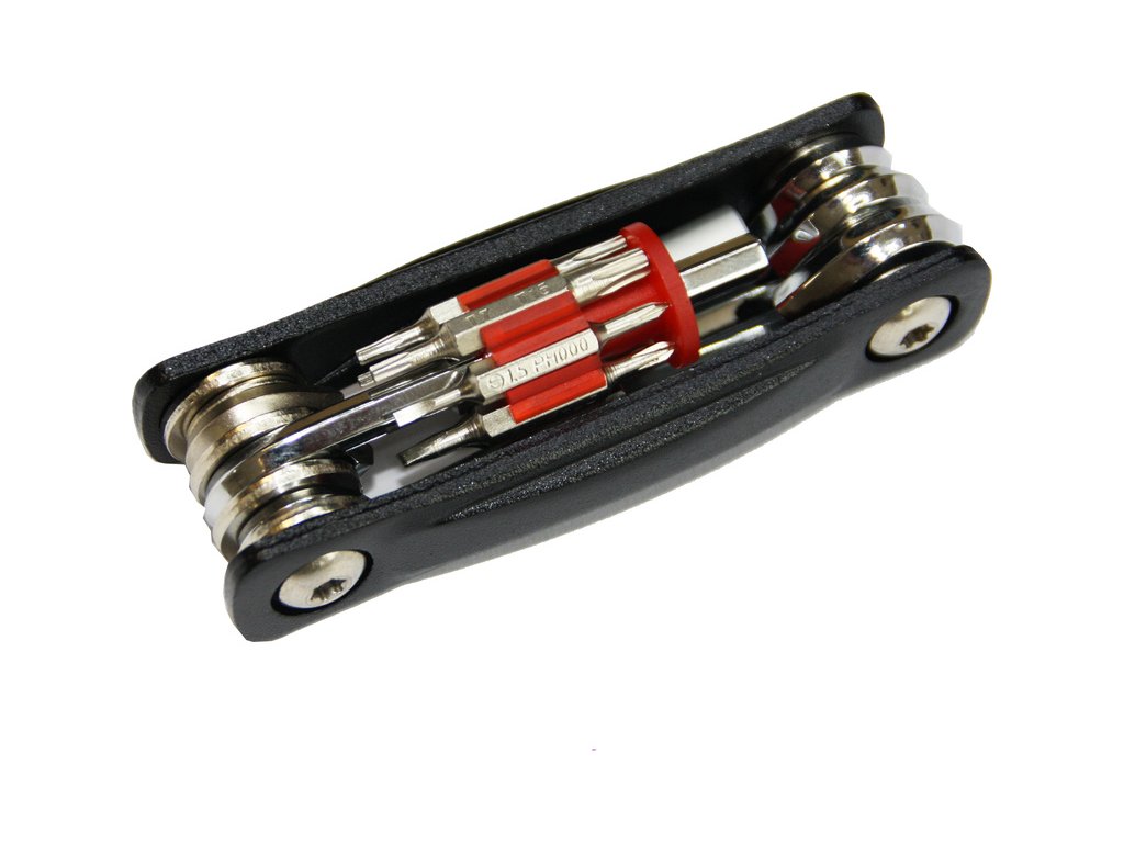 Multifunkční šroubovák s 20 různými druhy nástrojů. Imbus klíče 3; 4; 4,5; 5; 6, dále bity: torx T4, T5, T6, T7, T8, T9, T10, T15, ploché 1,5; 2; 2,5mm, Křížové PH000, PH00, PH0. Délka 88mm, šířka 32mm, síla 25mm.