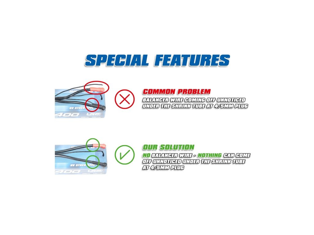 Tento nabíjecí kabel řeší častý problém, kdy se balanční vodič nepozorovaně odpojuje pod smršťovací bužírkou u 4/5mm konektoru, což je pro uživatele nezjistitelné a často se domnívá, že je baterie nebo nabíječka poškozená!