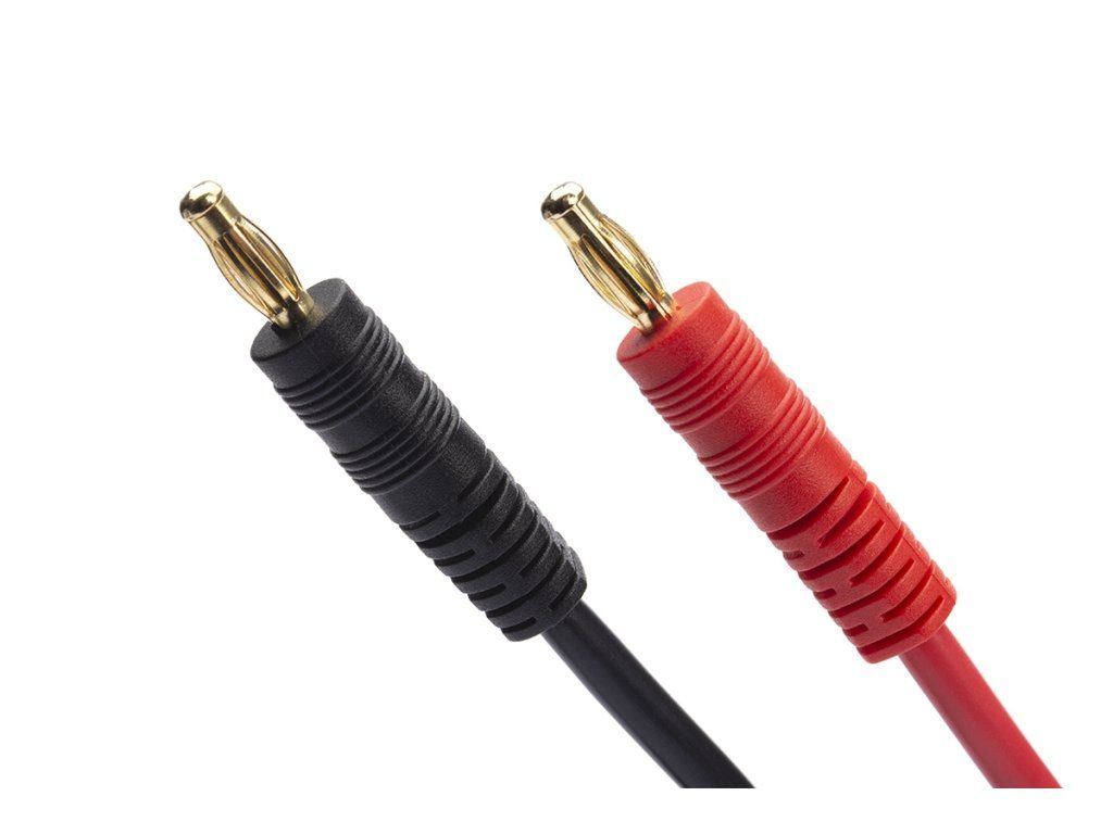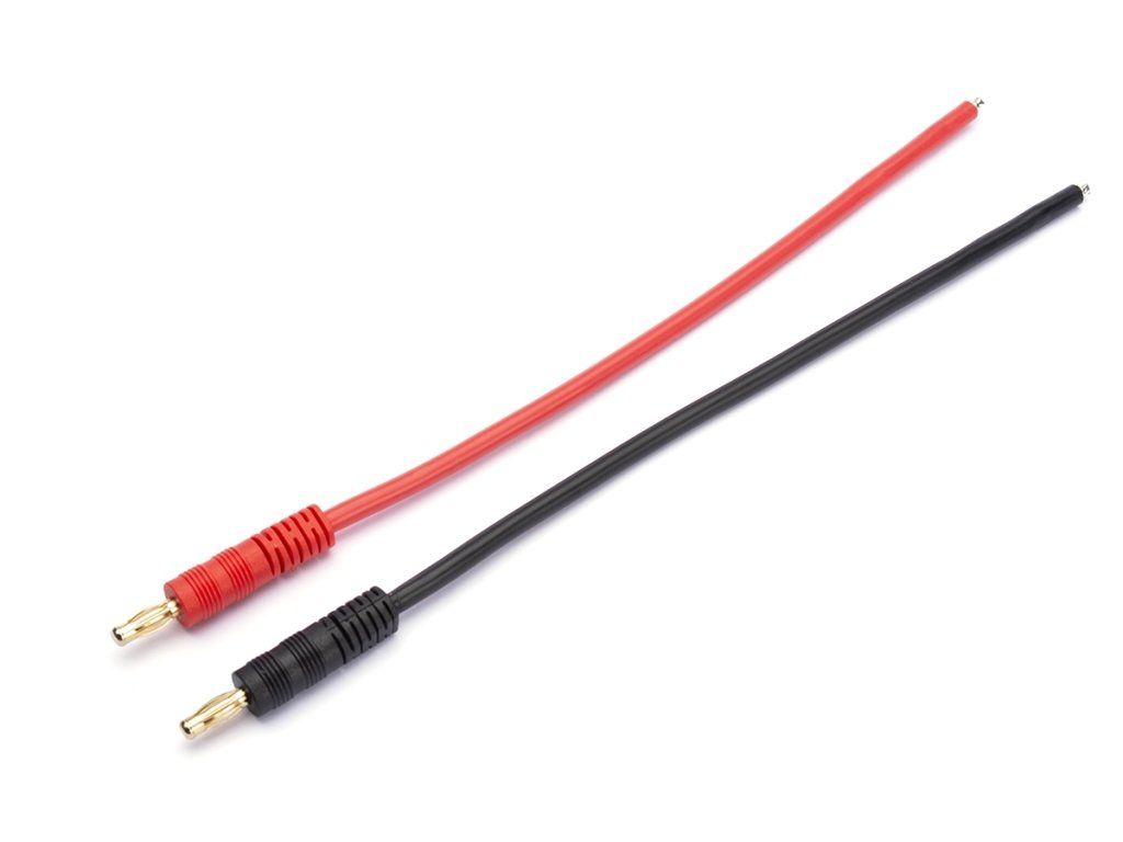 Černý + červený nabíjecí kabel se 4mm banánky na jedné straně a pocínovaným koncem na druhé straně. Délka 18cm. Kabel 12AWG.