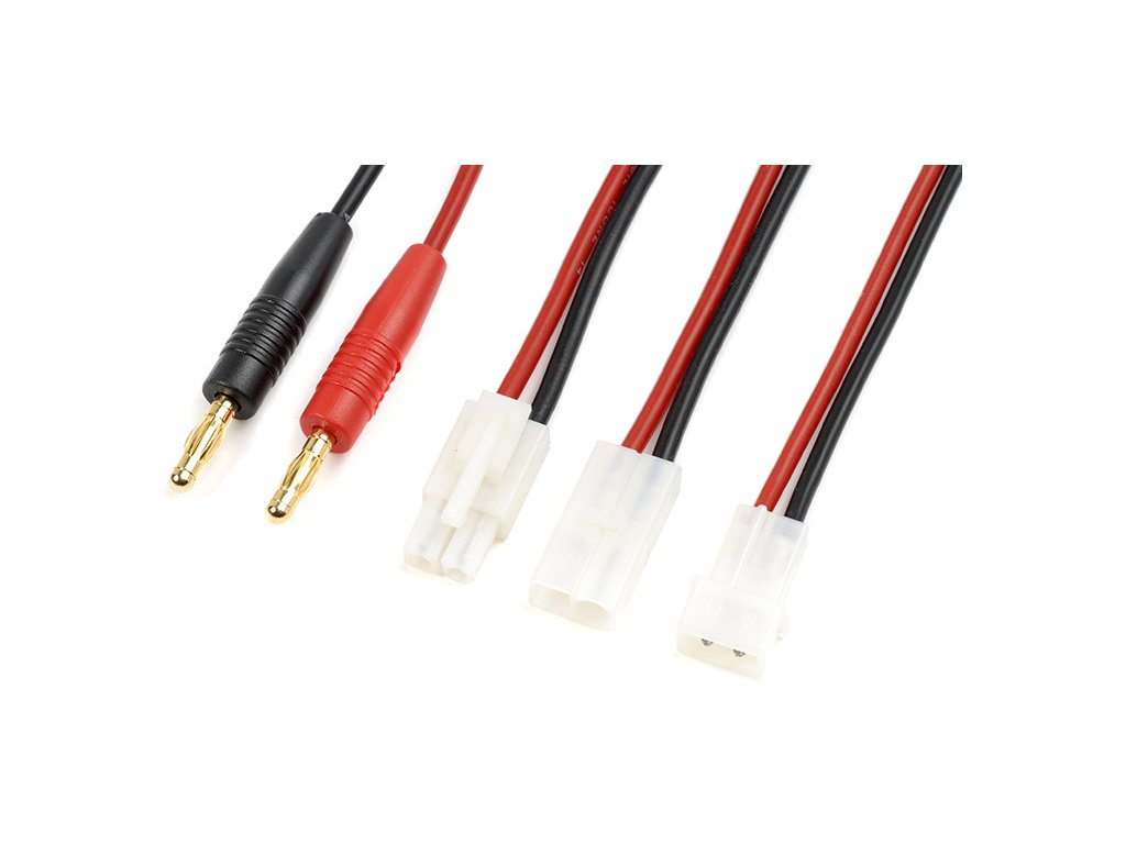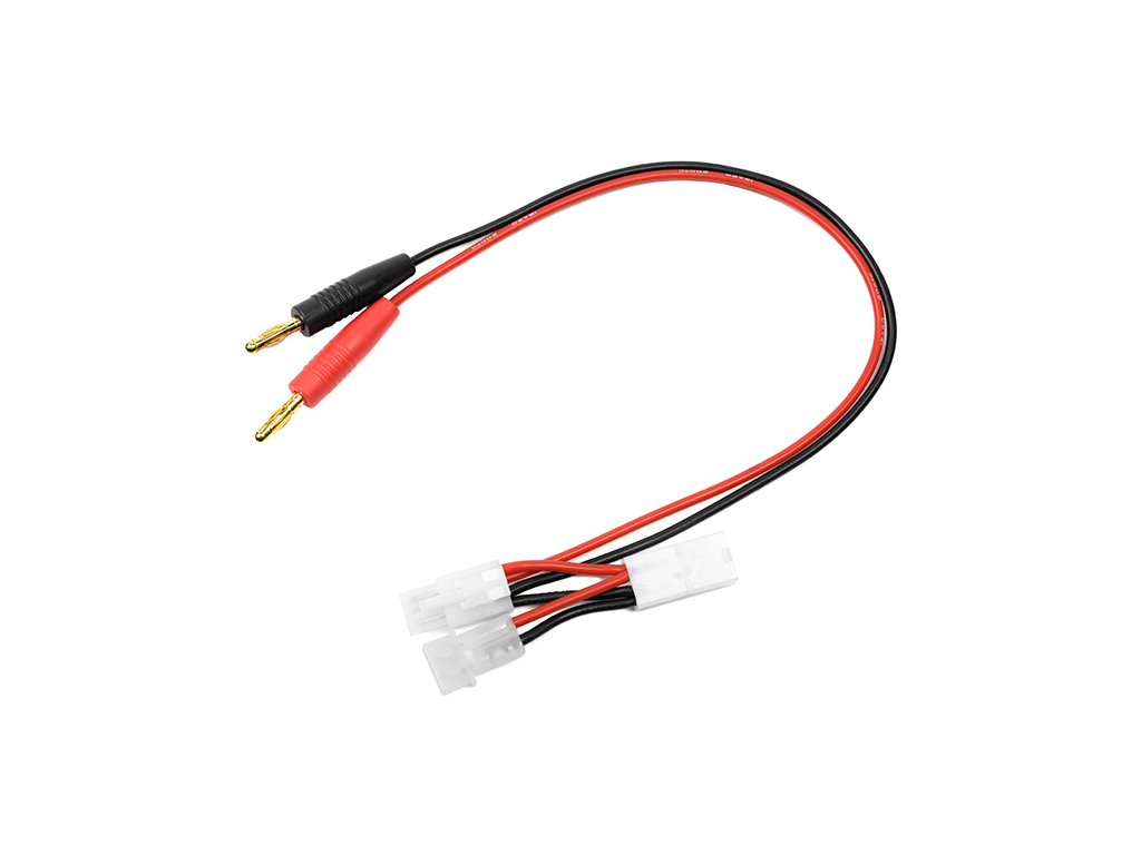 Nabíjecí kabel s banánky 4 mm paralelně zapojenými konektory: Tamiya baterie (samec) / Tamiya přístroj (samec) / AMP samice, kabel 16AWG