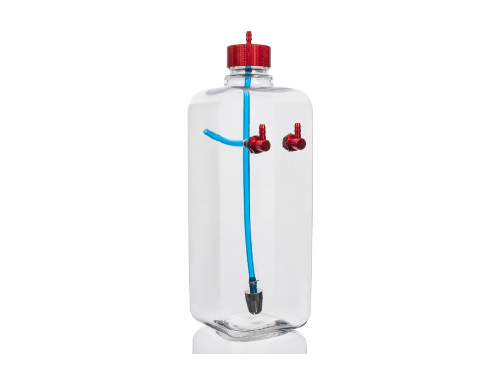 Palivová nádrž FlowMaster 1000 ml z odolného čirého plastu pro benzín. Eloxovaná hliníková zátka s integrovaným sacím hrdlem, mosazné fitinky a sací závaží. Rozměry 229x89x76,5 mm.Doplňkové parametry