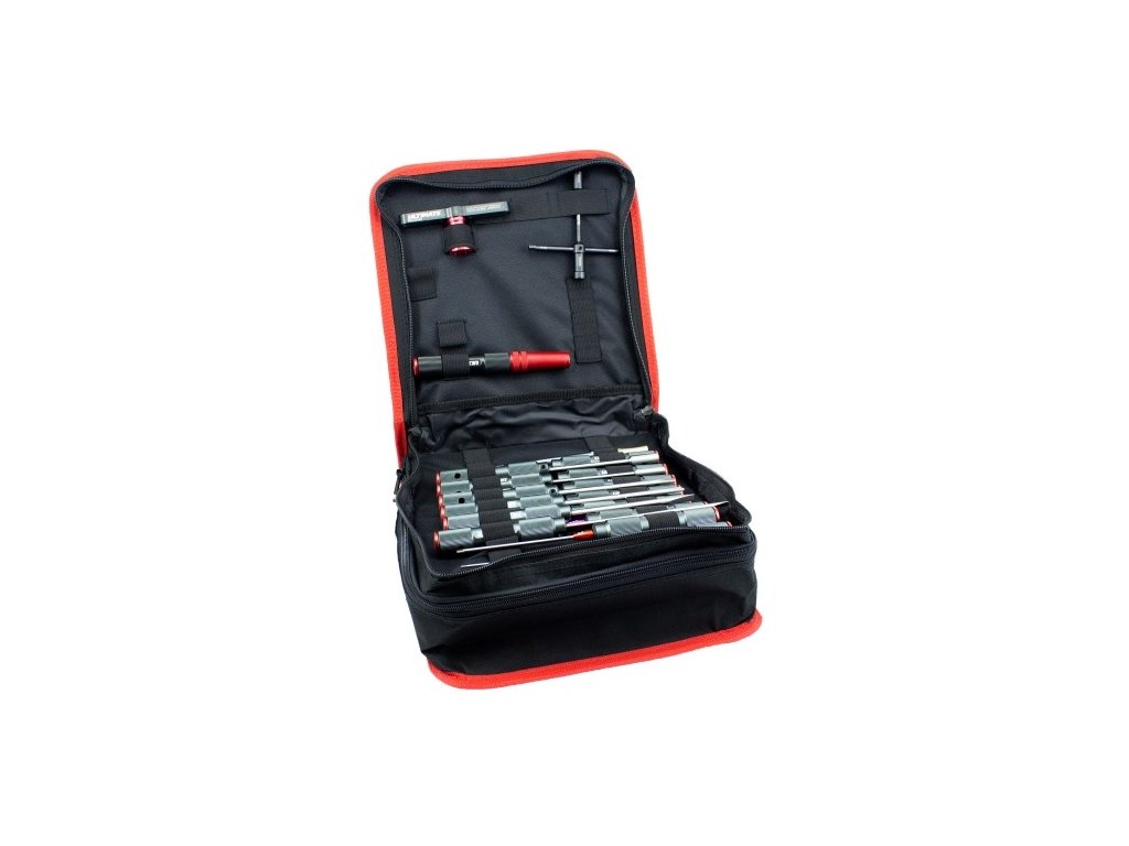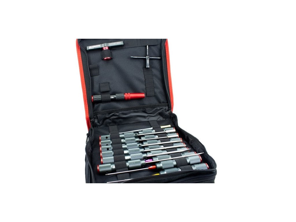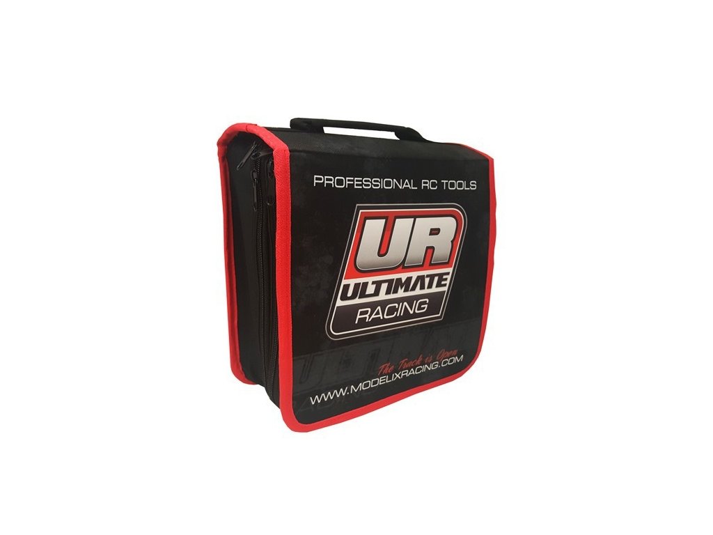 Toto je taška RC Team Tool Exkluzivní Racing se dvěma samostatnými přihrádkami pro uložení a nošení vašich RC nástrojů a příslušenství. Tato taška na nářadí UR je vyrobena z materiálu černého plátna s červeným lemováním a na horním krytu má logo UR. Kryty a boky byly vyztuženy silnými plastovými fóliemi, které zajišťují, že i když je taška plně naložená, nebude se otáčet ani ohýbat. Tato stylová taška má dva zipy pro dvě oddělené přihrádky a také silný praktický popruh pro pohodlnou manipulaci. Uvnitř nejvyšší úrovně je 34 elastických popruhů různých velikostí, které bezpečně udrží vaše nástroje UR během přepravy. Dno je prázdné silné a vyztužené pouzdro pro uložení všech ostatních nástrojů a příslušenství, které nikdy nevíte, kam uložit, jako jsou kartáče, kleště, rukavice atd.