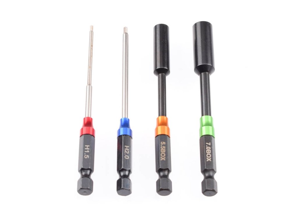 Sada klíčů RUDDOG je ideální sada pro všechny akumulátorové šroubováky. Díky standardnímu 1/4palcovému nástavci se hroty hodí pro všechny běžné akumulátorové šroubováky, což ještě více usnadňuje šroubování na vašem modelu. K dispozici jsou dvě sady: buď s šestihrannými hroty 1,5 mm, 2,0 mm, 2,5 mm a 3,0 mm, nebo jako sada s šestihrannými hroty 1,5 mm, 2,0 mm a 5,5mm a 7,0mm ořechovými hroty.