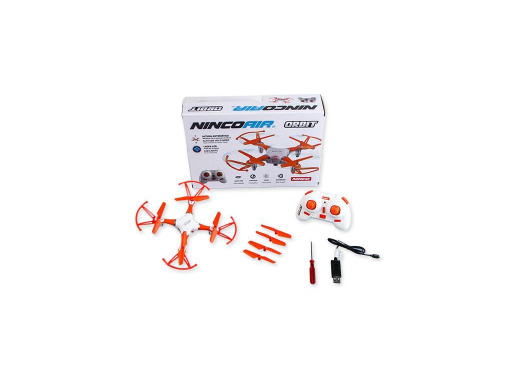 Balení obsahuje kompletně sestavený dron Nincoair Orbit. Čtyř kanálový vysílač 2,4 GHz. Vestavěný LiPo akumulátor 3,7V 150mAh, USB nabíječ. Dvě náhradní vrtule. Španělský, anglický, portugalský, německý, francouzský, italský a český návod. Pro provoz je nutné dokoupit 2x AA 1,5V baterie.