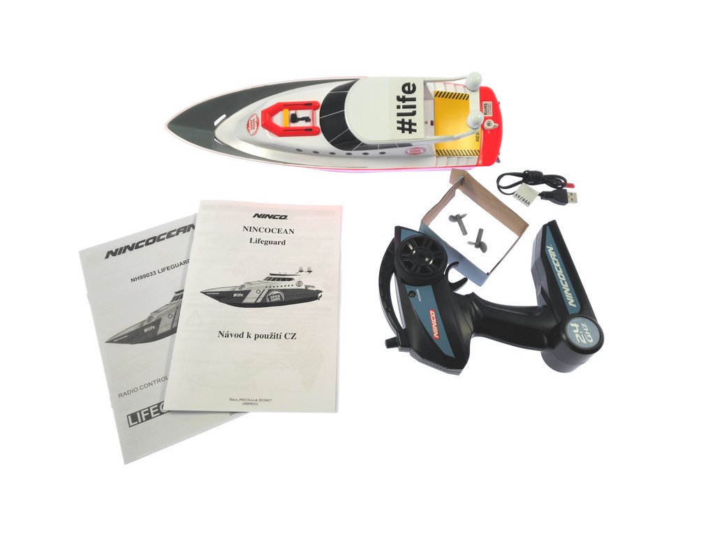 Loď na dálkové ovládání NINCOCEAN Lifeguard. Loď pobřežní stráže s množstvím detailů. Pohon a řízení pomocí dvou motorů s lodními šrouby. Napájení lithiovým akumulátorem, USB nabíječ. Moderní vysílač 2,4 GHz. Doba plavby přibližně 15 minut.