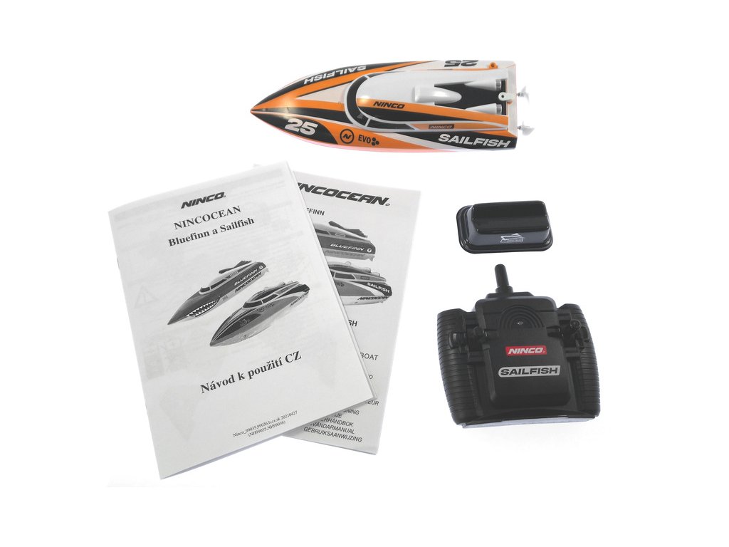 Balení obsahuje loď na dálkové ovládání NINCOCEAN Sailfish, vysílač 2,4 GHz. Návod CZ a manuál EN, ES, PT, DE, FR, IT, DK, NO, FI, SV, NE.