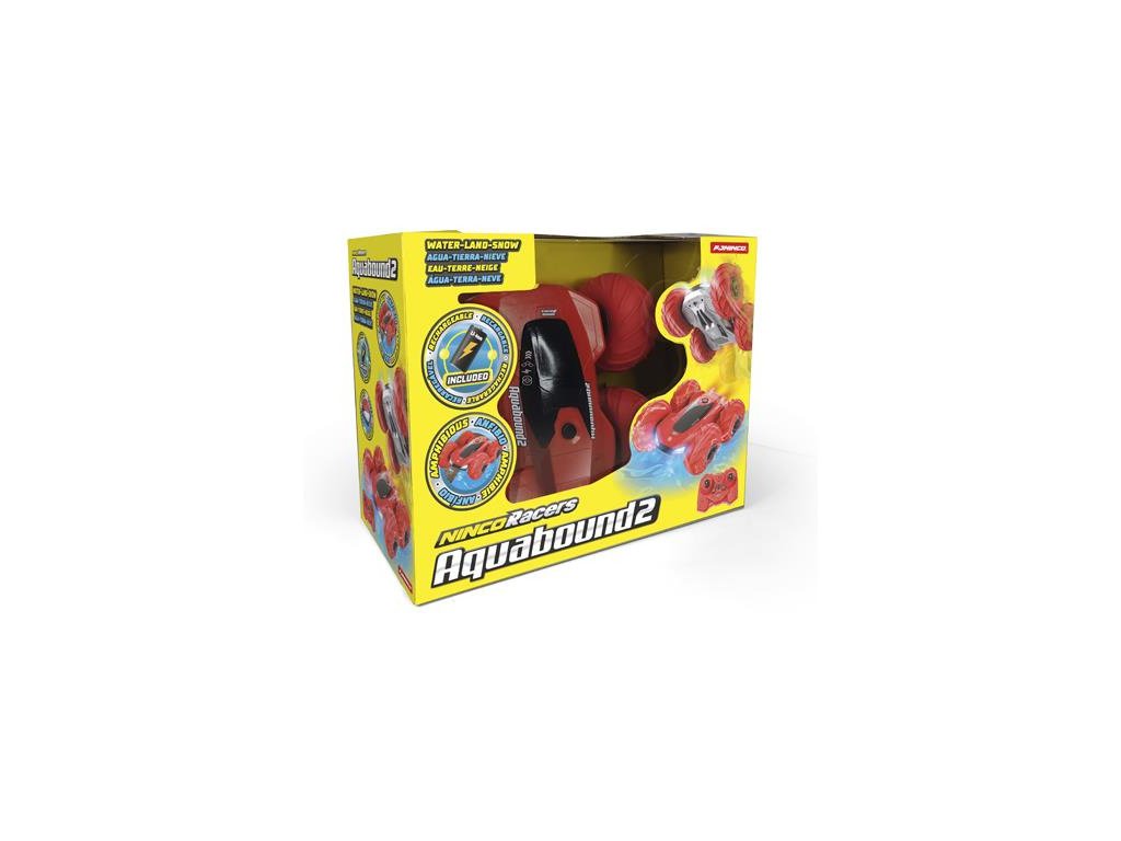 Obojživelný model od společnosti Ninco, Aquabound 2 s nafukovacími koly, díky kterým umí jezdit po souši i po vodě. Je oboustranný, tak že ho nic nezastaví. Plave, skáče, přetáčí se. Nově vybaven předními a zadními LED světly. Ovladač 2,4GHz. Akumulátor Li-ion 7,4V 500mAh a USB nabíječ.