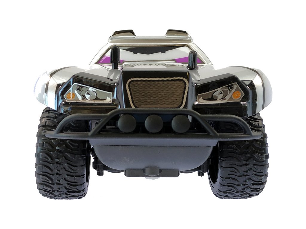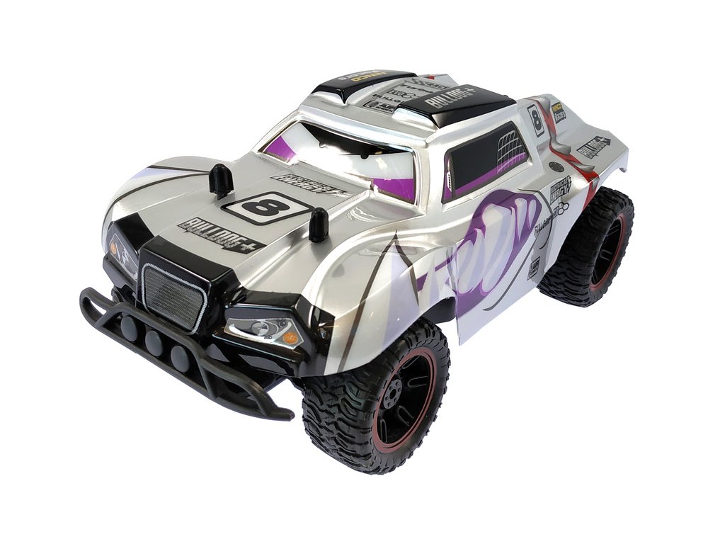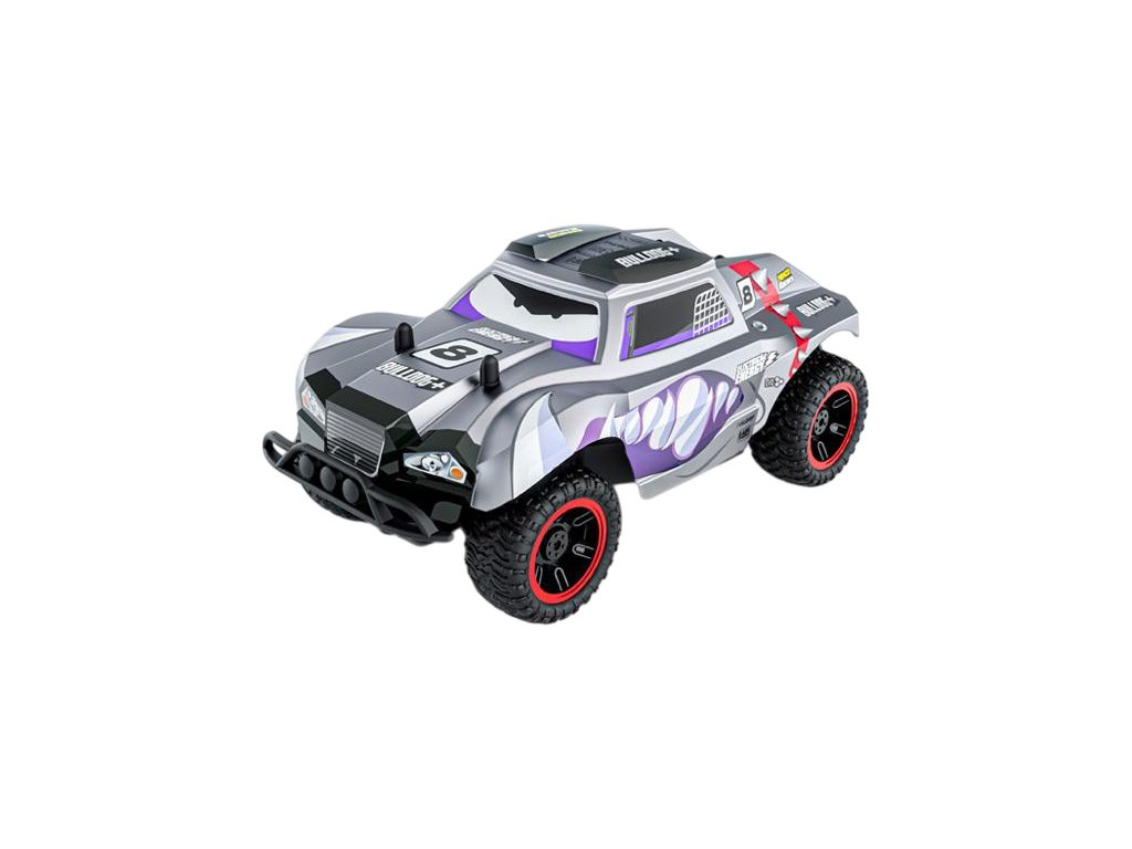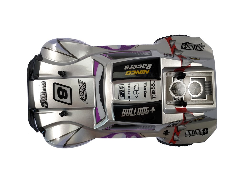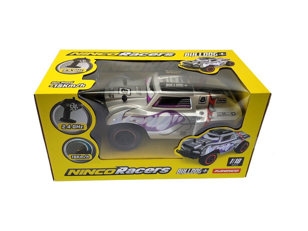 Terénní RC hračka pro děti Nincoracers Bulldog+ v měřítku 1:18 s délkou téměř 27 cm, patří do kategorie Short course. Díky větším rozměrů model lepé překonává nerovnosti v terénu. V předu je opatřen ochranným nárazníkem. Velká kola v kombinaci s pružinovými tlumiči skvěle kopírují terén. Karoserie je z odolného plastu. Má atraktivní šedé zbarvení s psí hlavy se zuby. Model jede rychlostí až 15 km/h. Model je na tužkové baterie.