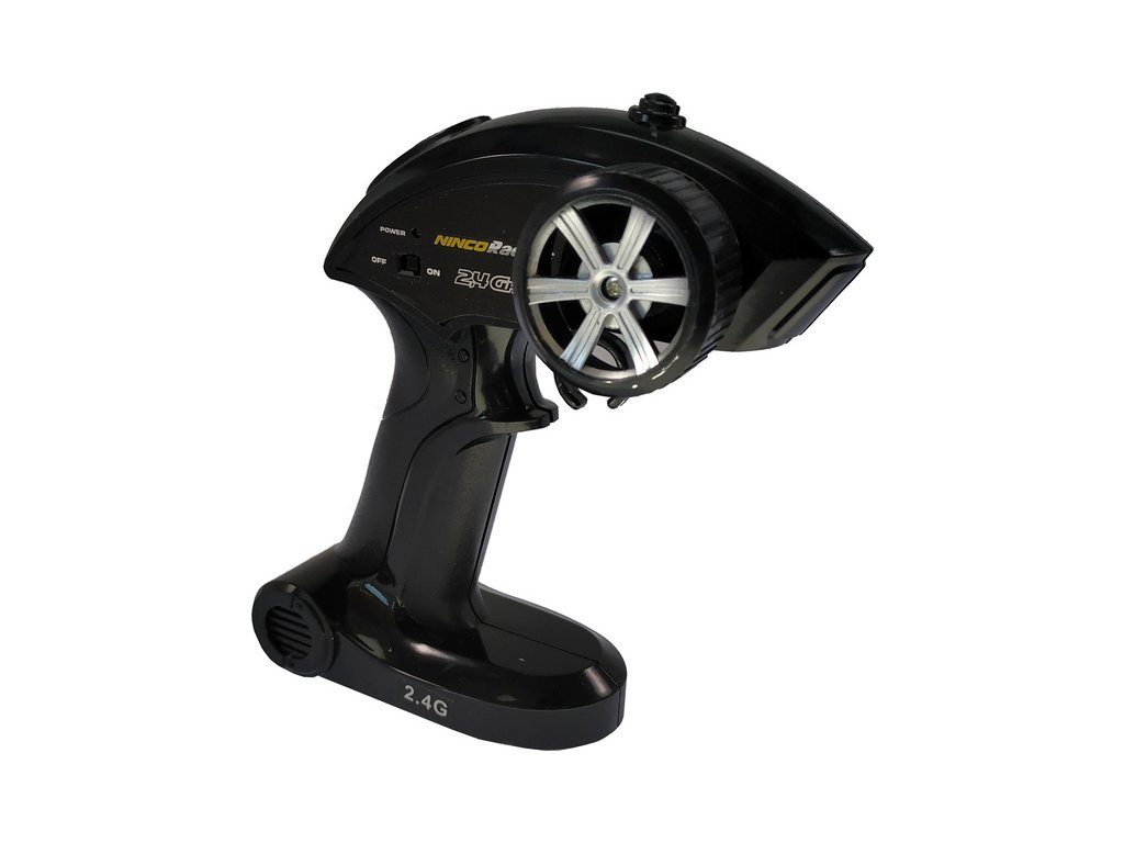 Volantový vysílač výborně padne do ruky. Pracuje na frekvenci 2,4GHz. Díky tomu nedochází k žádnému rušení. Má integrovanou anténu, která se už nikdy neulomí. Neutrální polohu kol lze jemně nastavit trimem ve spodní části auta.