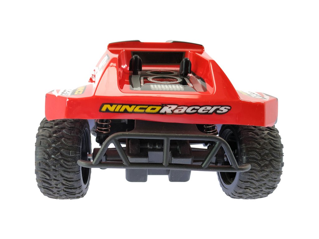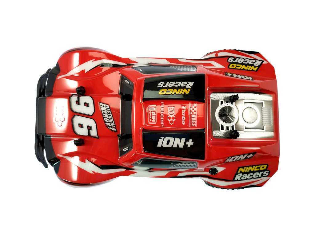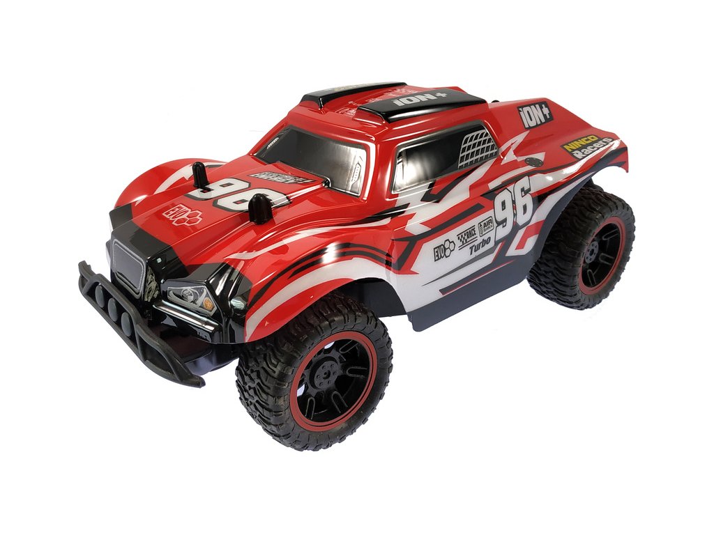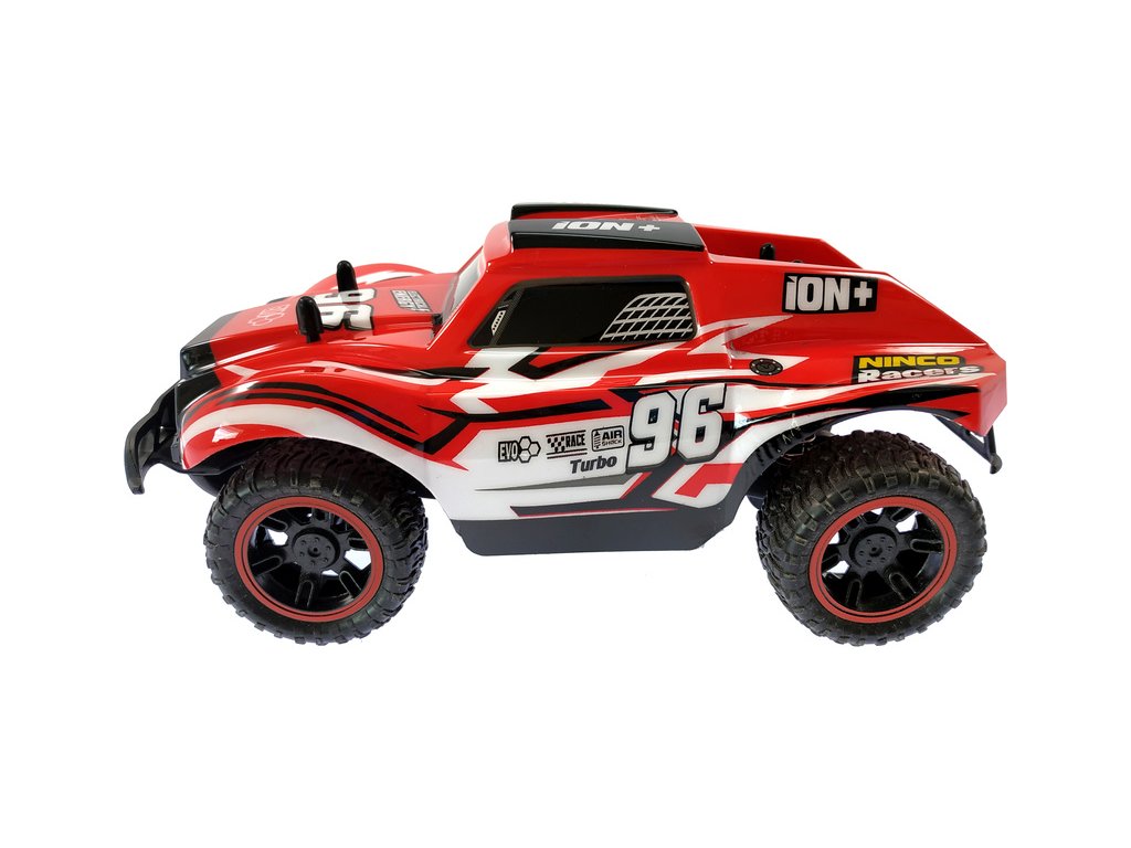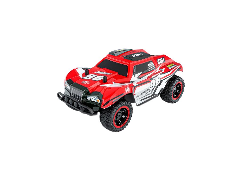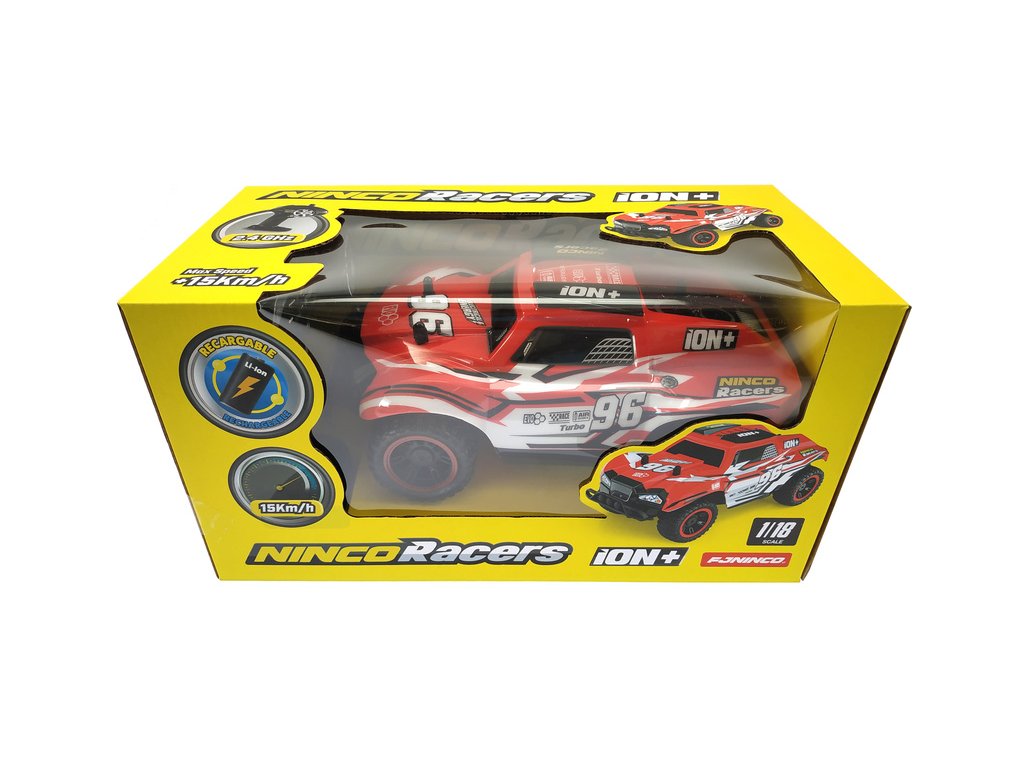 Terénní auto na dálkové ovládání Ninco ION+ v měříku 1:18. Auto je dlouhé 26,5 cm a dosáhne rychlosti až 15 km/h. Odolná karoserie s červenobílým závodním zbarvením. Pohon zadních kol. Velké terénní pneumatiky. Volantový vysílač 2,4GHz. Li-Ion akumulátor a USB nabíječ.